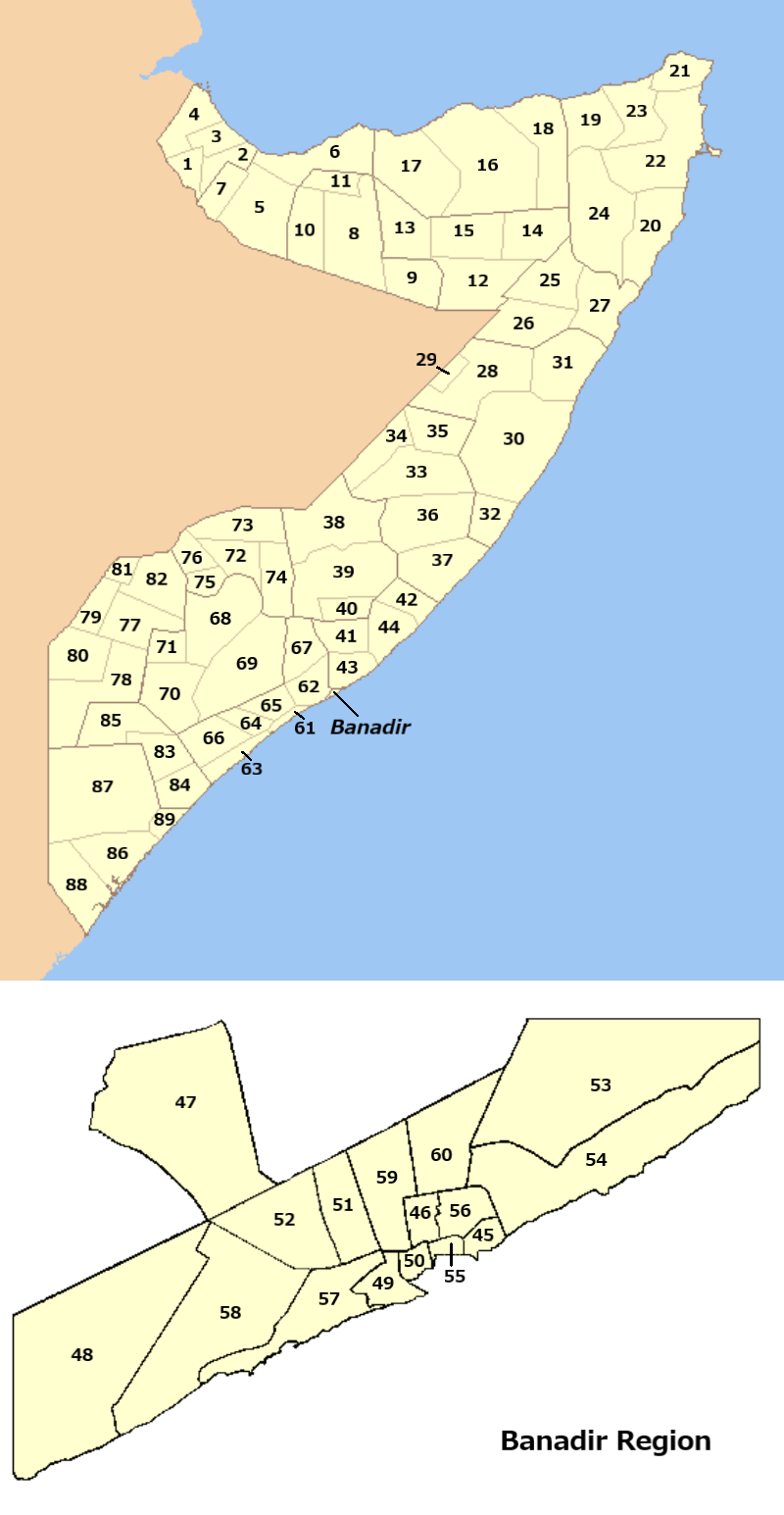12 | 바나디르 지역 | Banadir | Banaadir | 모가디슈 | 370 | 1,650,227 | 2,228,463 | 16 |