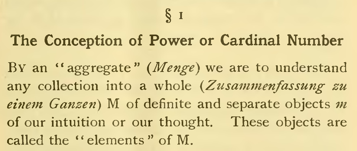'집합'이란 우리 생각이나 인식에 따라 구체적으로 구별되는 대상(이것을 집합 M의 '원소'라고 부른다)들을 전체로 묶어 놓은 것을 의미한다.[11] – 게오르크 칸토어