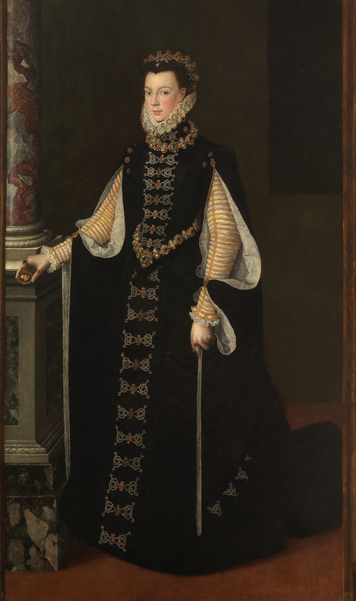이러한 종류의 그림은 안귀솔라가 초기에 명성을 쌓았던 비공식 초상화보다 훨씬 더 까다로웠는데, 왕족과 관련된 고급 직물과 정교한 보석의 많은 복잡한 디자인을 표현하는 데 엄청난 시간과 에너지가 소요되었기 때문이다. 그러나 이러한 어려움에도 불구하고 안귀솔라가 그린 엘리자베스 초상화와 펠리페 2세의 네 번째 부인인 안나의 초상화는 생생하고 생동감이 넘쳤다.[24]