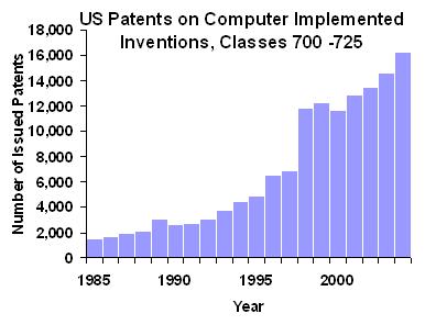 또한 인터넷과 전자 상거래의 확대는 많은 소프트웨어 및 비즈니스 방법에 관한 발명(비즈니스 모델 특허)의 출원을 증대시켰고, 일반적으로 특허가 되지 않는다고 여겨지던 대상에 특허가 인정되게 되었다. 1998년에는 큰 영향을 미치는 판결이 나왔다. 연방 순회 법원의 스테이트 스트리트 뱅크 사건 항소심 판결에서 종래 비즈니스 방법의 적용 제외를 부정하고, "유용하고 구체적인 유형의 애플리케이션인 경우, 소프트웨어에 기반한 시스템에 의해 실시되는 비즈니스 방법 프로세스는 특허가 가능하다"는 취지의 판시가 이루어진 영향은 컸다.