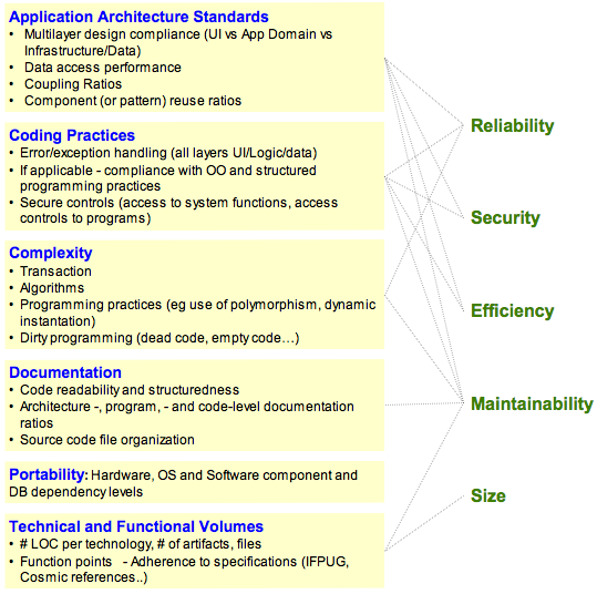 위 그림은 소프트웨어 품질 특성과 측정 가능한 속성 간의 관계를 보여준다. 사용자나 비즈니스 시스템 소유자에게 중요한 특성(오른쪽)은 측정 가능한 속성(왼쪽)에 따라 달라진다. 이러한 속성에는 애플리케이션 아키텍처 및 코딩 관행, 애플리케이션 복잡성, 문서화, 이식성, 기술 및 기능 볼륨 등이 포함된다.