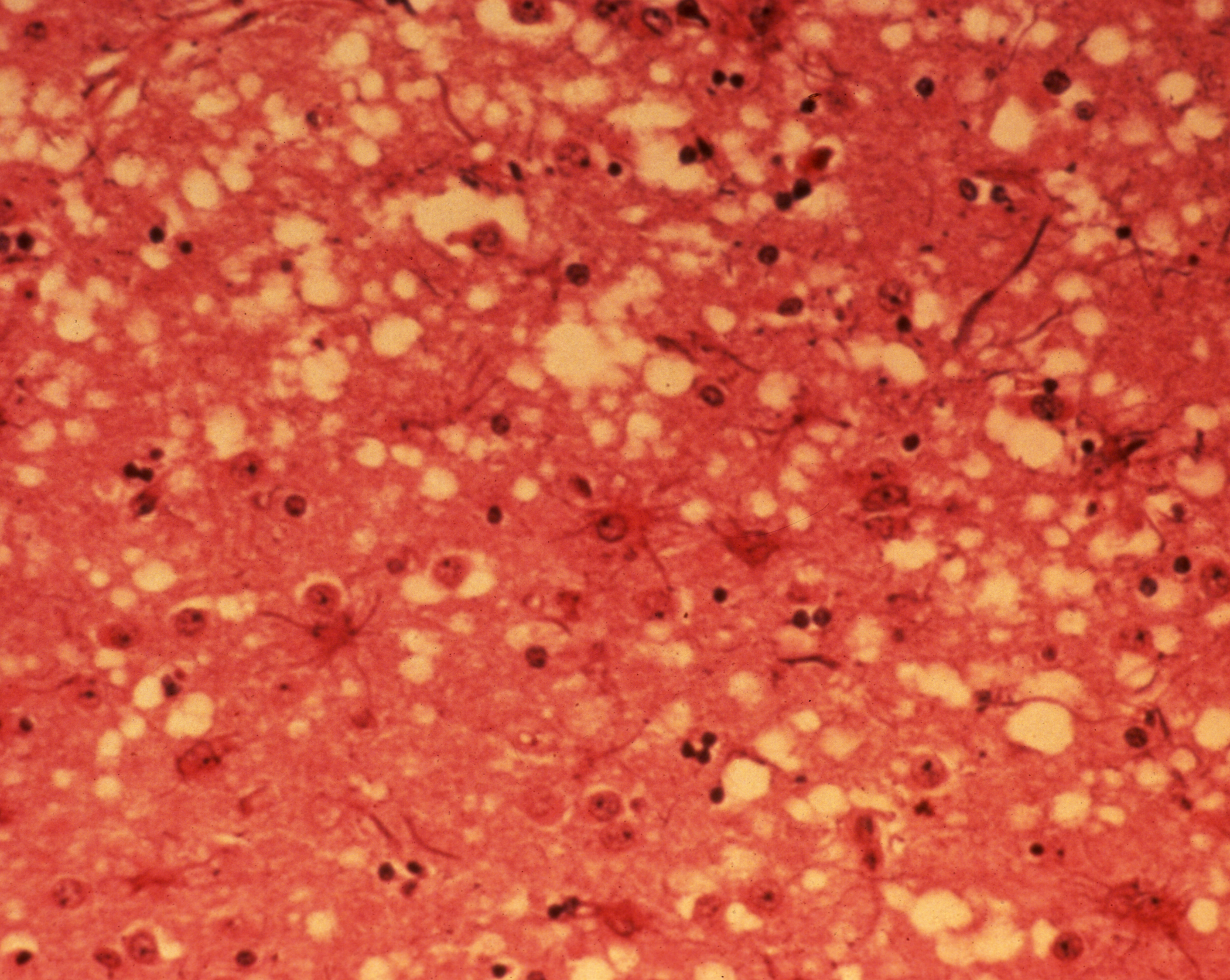 BSE에 걸린 소의 뇌 조직으로, 회백질에서 전형적인 미세한 "구멍"이 나타난다.