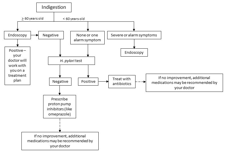 경보 기능이 없는 55세 미만의 사람들은 내시경 검사를 필요로 하지 않지만 헬리코박터균 감염으로 인한 소화성 궤양 질환에 대한 조사를 고려한다. 헬리코박터 파일로리 감염에 대한 조사는 보통 지역사회에서 이러한 감염의 중간에서 높은 확산이 있거나 소화불량이 있는 사람이 헬리코박터 파일로리 감염에 대한 다른 위험 요인을 가지고 있을 때 수행된다. 예를 들어, 헬리코박터 파일로리 감염은 높은 사전 예방 지역으로부터의 인종이나 이민과 관련이 있다. 감염이 확인되면 대개 약물치료로 근절될 수 있다.