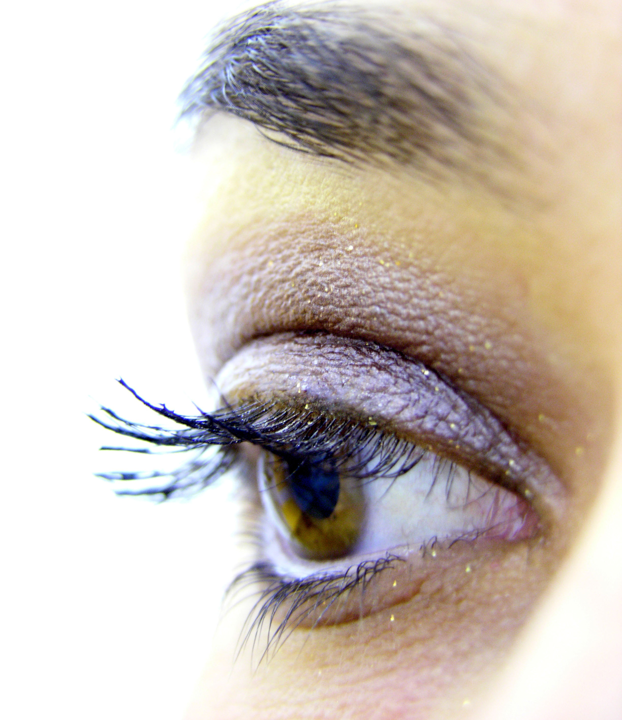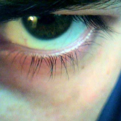 눈꺼풀을 열고 올려다보며 카메라를 응시하고 있을 때의 사람의 속눈썹. 아래 속눈썹은 가늘고 드문드문하며 아래로 뻗어 있다. 위 속눈썹은 약간 위로 휘어져 젖혀져 있으며, 굵고 밀집되어 있고, 이 각도에서는 (눈꺼풀의 곡면과의 관계에서) 눈꼬리 부근이 특히 튀어나와 보인다.