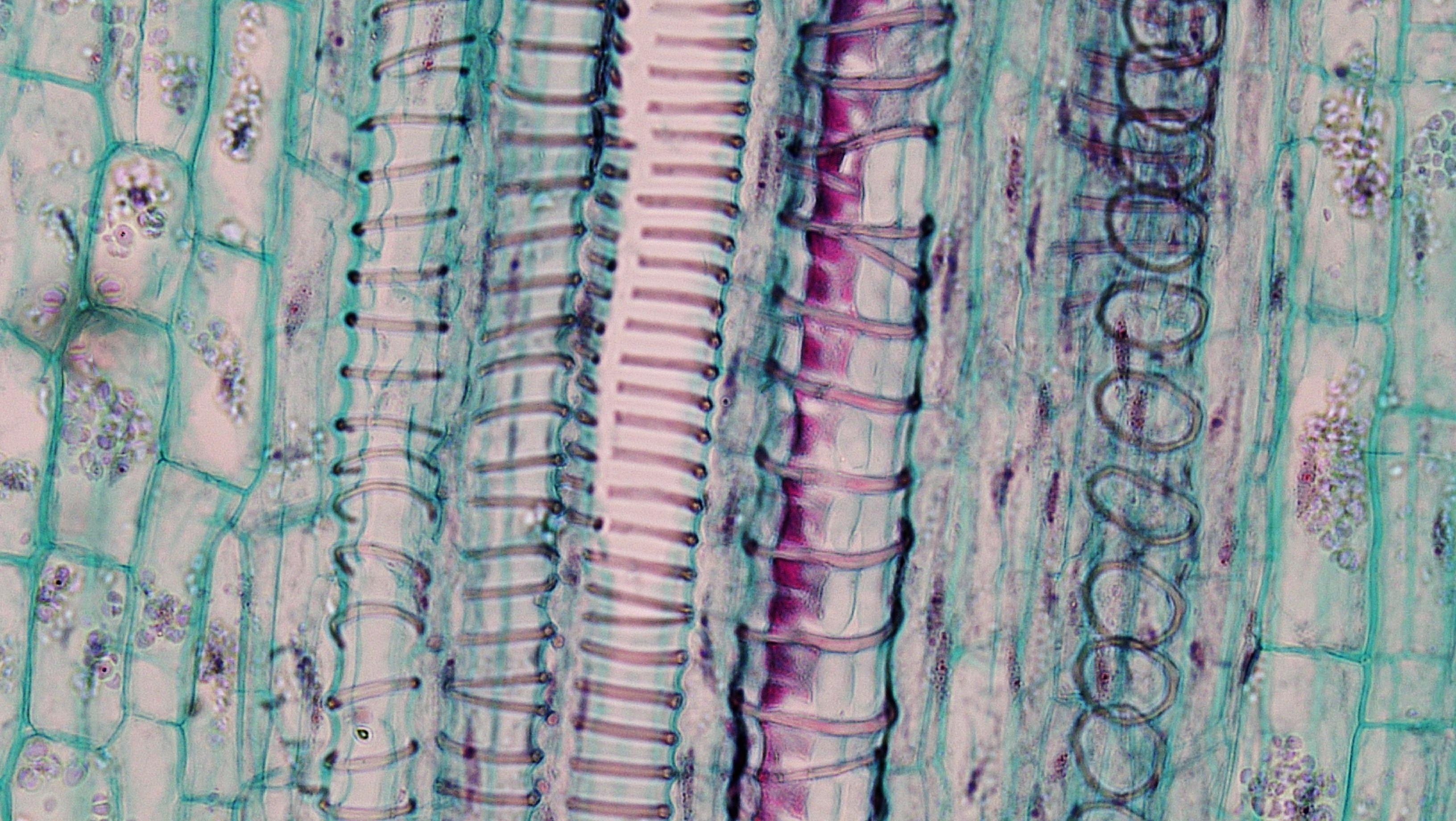 관다발 | 동심원 모양으로 배열, 안쪽에 물관부, 바깥쪽에 체관부, 때로는 물관부를 사이에 두고 양쪽에 체관부가 배열 | 불규칙적으로 흩어져 있음 |