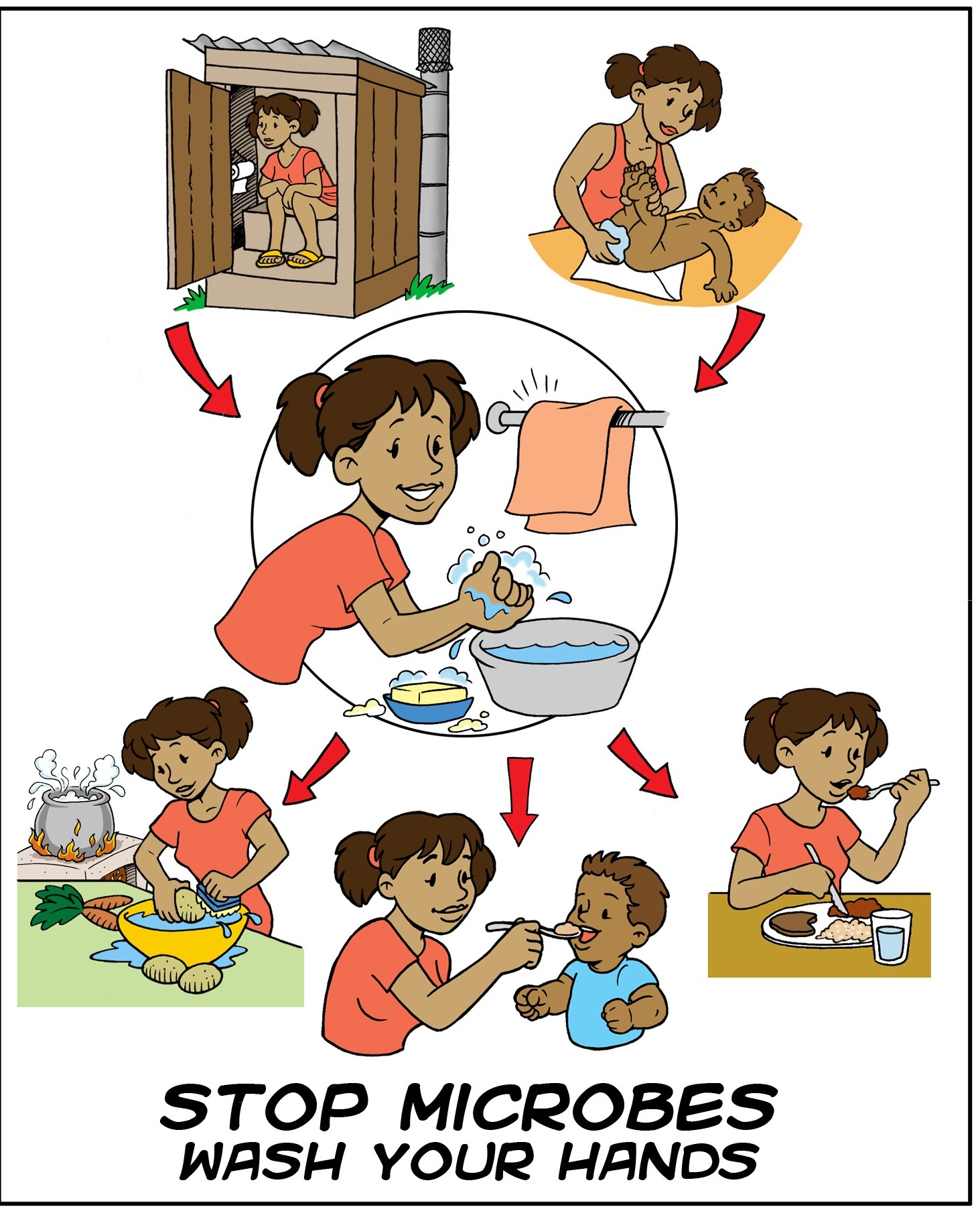 분변-구강 감염을 줄이기 위해 비누로 손을 씻어야 하는 중요한 시점은 화장실 사용 후, 아이의 엉덩이를 닦은 후, 아이에게 음식을 먹이기 전, 식사 전, 그리고 음식을 준비하거나 날고기, 생선, 가금류를 취급하기 전/후이다.[7]