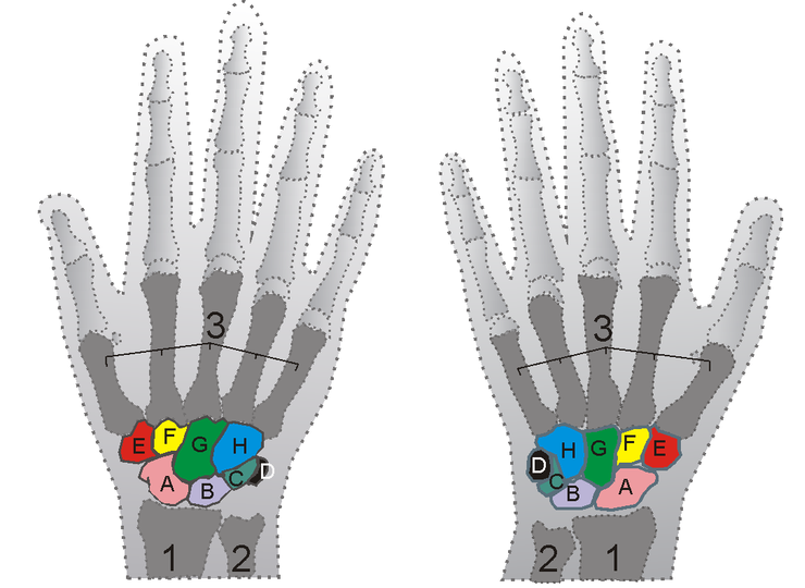 뼈 평균 변동[6] 변동[7] 머리뼈 2.5개월 1–6개월 1–5개월 갈고리뼈 4–5.5개월 1–7개월 1–12개월 세모뼈 2년 5개월~3년 9개월~4년 2개월 반달뼈 5년 2–5.5년 18개월~4년 3개월 큰마름뼈 6년 4–8년 작은마름뼈 6년 4–8년 손배뼈 6년 4–7년 콩알뼈 12년 8–12년