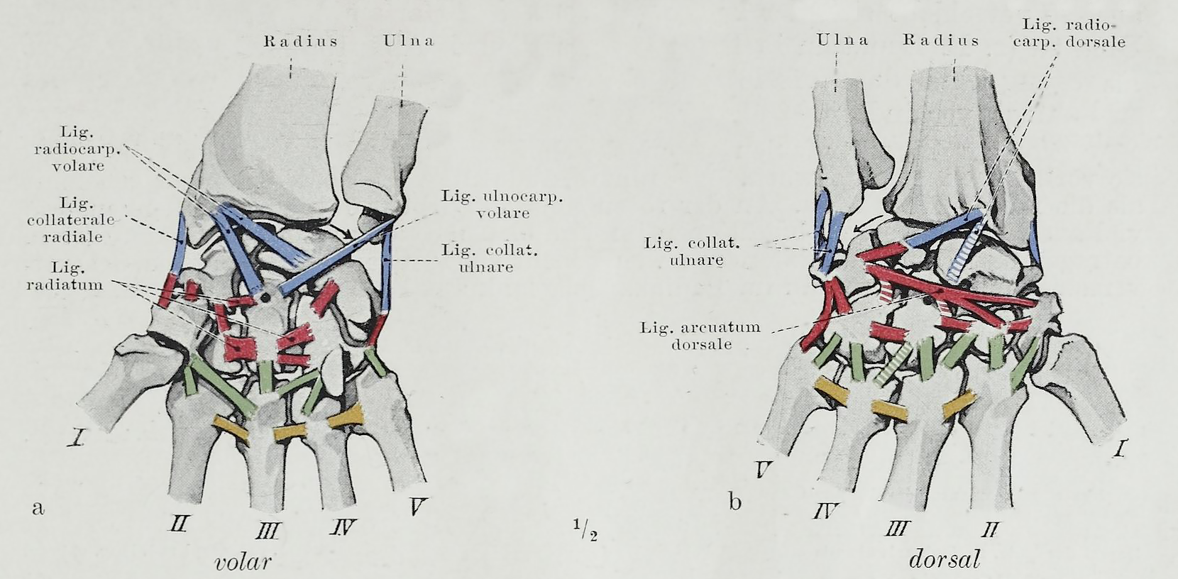 손목뼈와 자뼈 및 노뼈를 연결하는 손목 자체의 인대 | 자쪽 인대, 노쪽 인대, 손목 앞쪽 인대, 손목 뒤쪽 인대, 자쪽 손목 인대 (그림에서 파란색) |