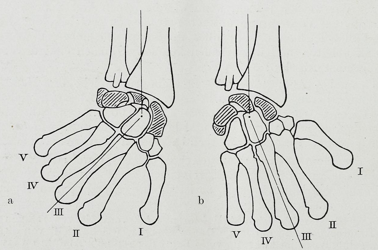 큰머리뼈 | 손배뼈, 반달뼈 | 작은마름뼈, 갈고리뼈 | 세 번째, 부분적으로 두 번째 및 네 번째 중수골 |