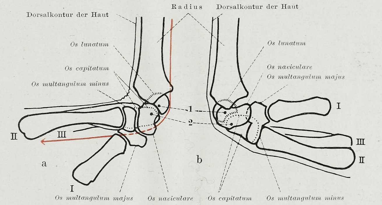 손배뼈 | 요골 | 큰머리뼈, 반달뼈 | 큰마름뼈, 작은마름뼈 |