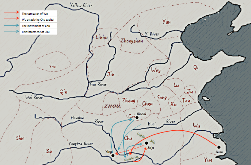 6년 후인 기원전 506년, 초나라가 오나라의 보호를 받던 당과 채를 공격하자, 합려는 손무와 오자서를 장수로 삼아 출동시켰다. 오나라와 초나라는 한수 강가인 백거에서 회전을 벌였다(백거 전투). 손무의 양동 작전으로 초나라 군의 주력은 다른 지역으로 유인되었고, 오나라 군 본대가 수도로 향한다는 정보에 급히 전진해왔기 때문에, 전장에 도착했을 때는 강행군의 연속으로 이미 지쳐 있었다. 3만의 오나라 군은 20만의 초나라 군을 크게 무찌르고, 5번 싸워 5번 모두 승리하여, 열흘 만에 초나라의 왕도인 영성을 함락시키고 초나라 소왕을 도망하게 했다.