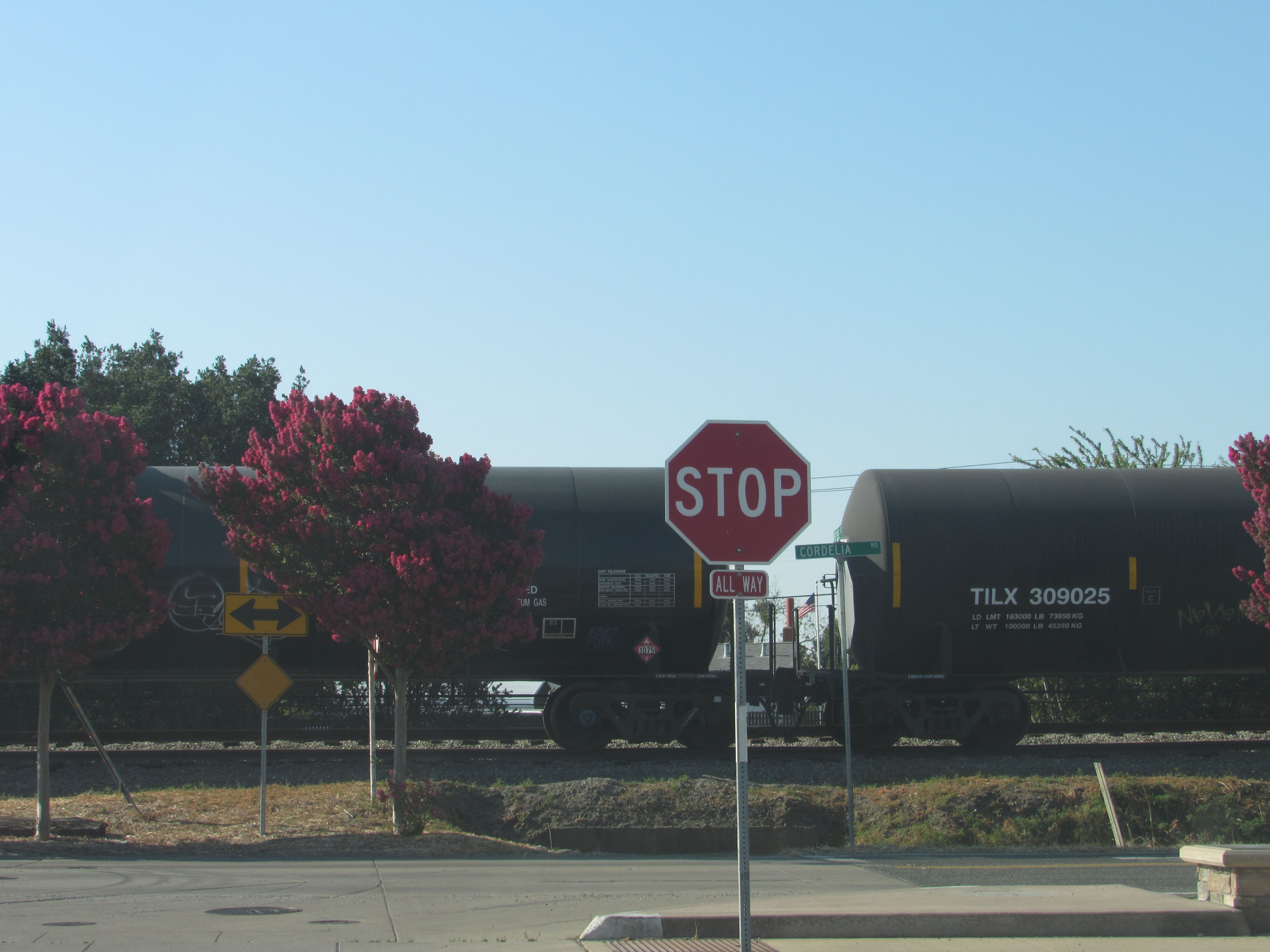 캘리포니아 코델리아 교차로에서 정지 표지판 뒤에 있는 기차