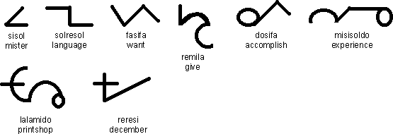 각 음절은 특정 개념을 나타내는 상징으로 묶였다. '솔'로 시작하는 단어는 예술, 학문과 관련되며, '솔솔'처럼 반복되면 질병, 의료와 관련된 단어가 된다. 음절을 거꾸로 배열하면 반의어가 된다. '팔라(fala)'는 좋음, '라팔(lafal)'은 나쁨을 의미한다.[10]