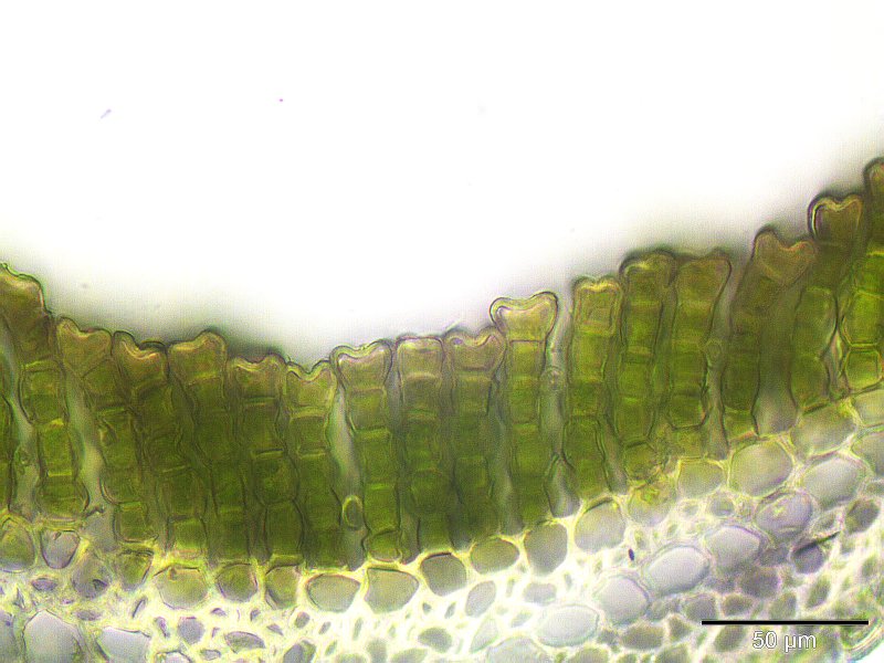 잎 표면을 따라 뻗어 있는 세포 융기인 라멜라는 단면에서 물결 모양이며 5~9개의 세포 높이다. 가장자리 세포는 좁을 수 있지만, 일반적으로 아래에 있는 것보다 크고 넓다. 얕게 파인 형태에서 깊게 파인 형태이며, 드물게 수직 분할로 나뉜다. 이 세포들은 매끄럽고 갈색을 띠며 상대적으로 두꺼운 세포벽을 가지고 있다. 잎집 세포는 길이가 60~90 μm이고 너비가 10~13 μm이다. 길쭉한 직사각형이거나 폭보다 최대 20배 긴 강하게 선형적인 구조일 수 있다. 가장자리로 갈수록 좁아진다. 가장자리 잎판 세포는 너비가 10~15 μm이고 거의 사각형이다.[3]