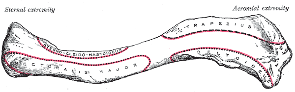 안쪽 부위(흉골 부위)는 전체 뼈 길이의 2/3에 걸쳐 바깥쪽과 앞쪽으로 길게 굽어 있고, 납작한 바깥쪽 부위(견봉 부위)는 견갑골의 견봉과 관절을 이루도록 뒤쪽으로 더 크게 굽어 있다. 안쪽 부위는 가장 긴 부분이고, 바깥쪽 부위는 가장 넓고 얇다. 바깥쪽 끝의 거친 아래쪽 표면에는 능형선과 '''유돌기'''(부리돌기 위)라는 둥근 돌기가 있는데, 이는 어깨 근육과 인대가 부착되는 부위이다.