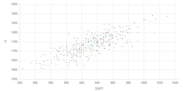 키와 어깨 너비의 상관관계가 통계학적 무의미하다는 것을 이해하기 위해, 유의미한 차이가 큰 앉은 키와 키의 상관관계를 나타낸 위 그래프와 대조해 볼 수 있다.