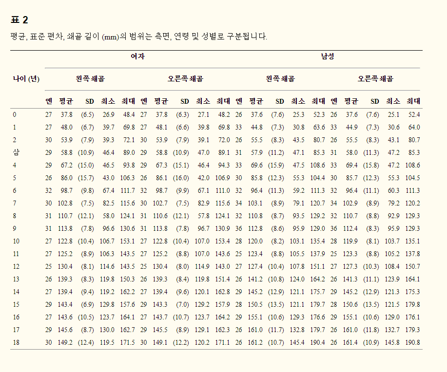 위 그래프는 완전한 너비 골격(쇄골, 견갑골, 견봉)의 성장이 끝난 25-29세를 대상으로 표본 자료를 연구한 것이다.[47]