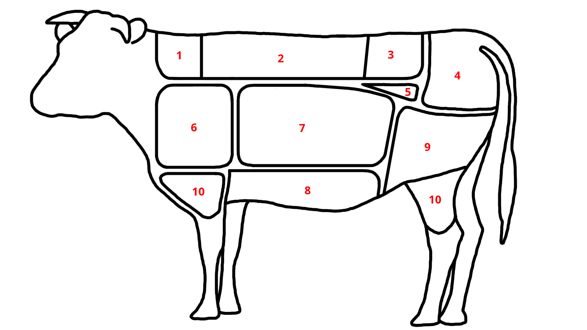 소를 도축하여 머리, 우족, 껍질, 내장을 제거한 상태를 지육(carcass)이라고 하며, 이 지육을 좌우 대칭으로 이등분한 것을 이분체(half carcasses)라 한다. 이분체를 위아래로 절단하면 전사분체(forquarter)와 후사분체(hindquarter)가 된다. 큼직한 덩어리 형태로 분할하면 몇 개의 대분할육이 생산된다. 척(chuck), 브리스킷(brisket), 리브(rib) 등은 미국이나 캐나다에서의 대분할육 명칭이며, 이 대분할육에서 소 분할육들이 나온다.