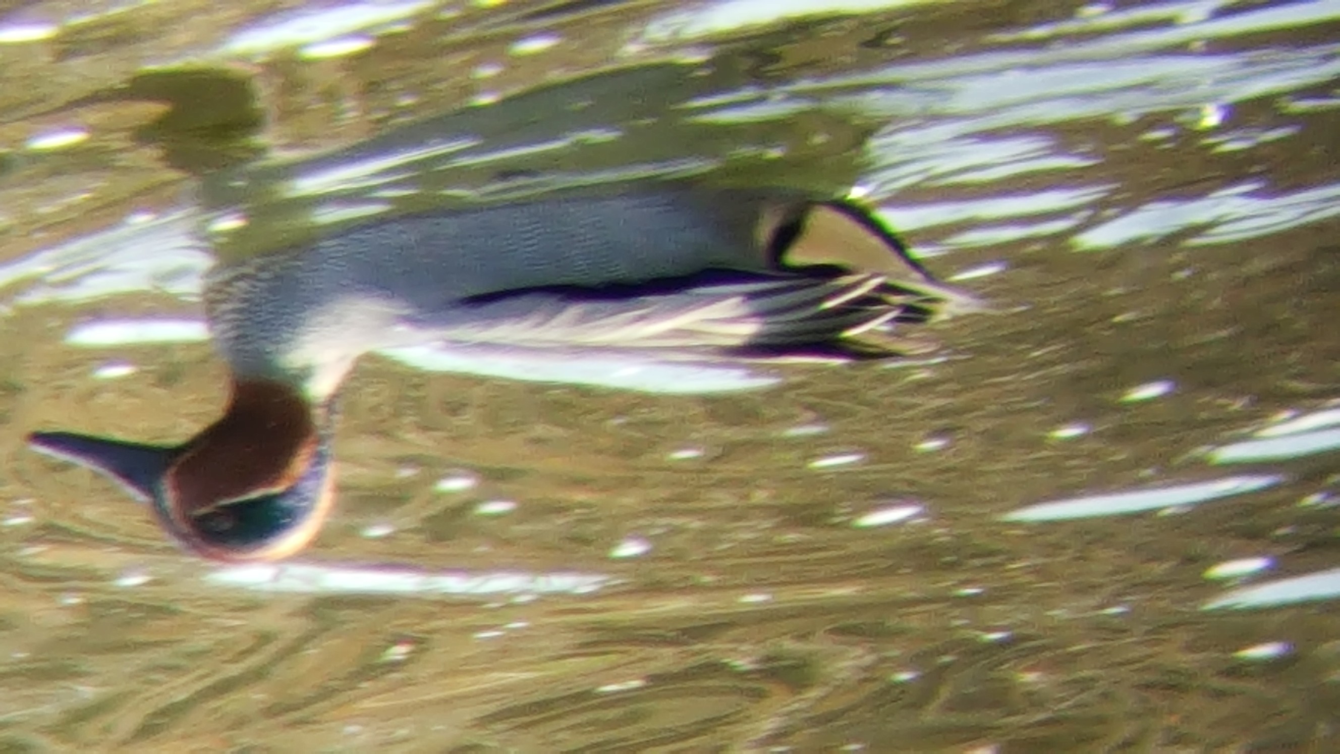 혼인색을 띤 수컷은 멀리서 보면 어두운 머리, 누런 뒤쪽, 측면을 따라 흰색 줄무늬가 있어 회색으로 보인다. 머리와 목 윗부분은 밤색이며, 눈 바로 앞에서 시작하여 목 뒷부분 위쪽으로 이어지는 반달 또는 물방울 모양의 넓고 무지개빛을 띠는 짙은 녹색 반점이 있다. 이 반점은 얇은 황백색 선으로 둘러싸여 있으며, 이 색의 단일 선이 반점의 앞쪽 끝에서 시작하여 부리의 기저부를 따라 굽어진다. 가슴은 작은 둥근 갈색 반점이 있는 황갈색이다. 배의 중앙은 흰색이며, 나머지 몸 깃털은 대부분 흰색에 얇고 촘촘한 검은색 잔물결 무늬가 있어 가까운 거리에서도 중간 회색으로 보인다. 바깥쪽 어깨 깃털은 흰색이며, 바깥쪽 날개에 검은색 테두리가 있어 새가 휴식을 취할 때 흰색 측면 줄무늬를 형성한다. 주 날개깃은 짙은 회갈색이며, 거울깃은 흰색 팁이 있는 무지개빛 검정 녹색을 띤다. 큰 위날개 덮개의 황백색 팁과 함께 거울을 형성한다. 겨드랑이는 흰색이며, 회색 날개깃, 안쪽 덮개에 짙은 반점, 짙은 앞쪽 가장자리가 있다. 꼬리와 꼬리 덮개는 검은색이며, 각 측면의 덮개 중앙에 밝은 황갈색 삼각형 반점이 있다.
