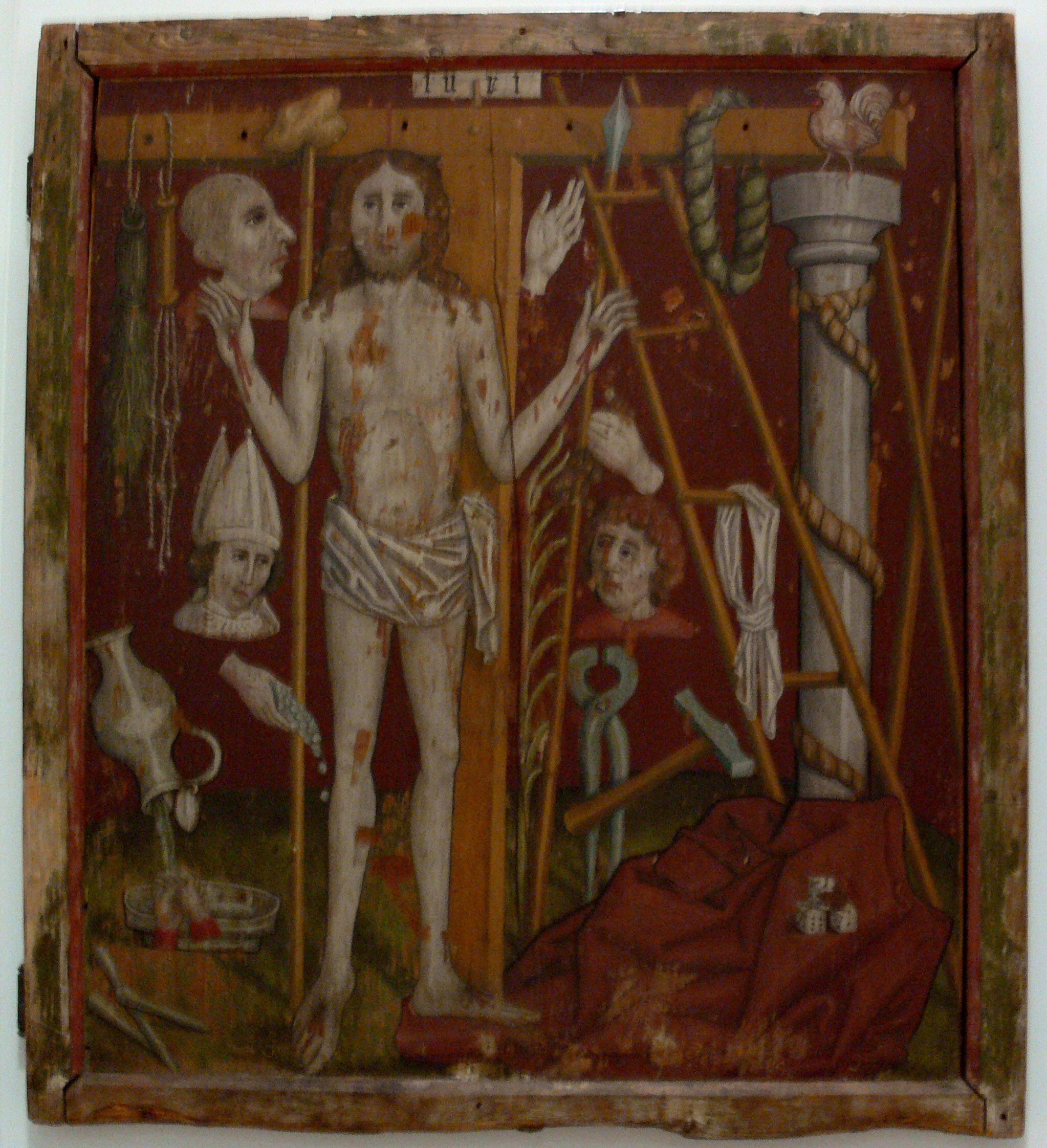- 미술: 그리스도의 수난은 수천 번 묘사되었고, 고유한 도상학적 전통을 발전시켜 왔다. 알브레히트 뒤러의 판화 연작처럼 수난은 종종 연작으로 다루어진다. 슬픔의 인간 또는 피에타와 같은 경건한 이미지는 수난 이야기에서 파생되었다. ''아르마 크리스티''(수난의 도구)는 십자가, 가시면류관, 롱기누스의 창 등 예수의 수난과 관련된 물건들이다.