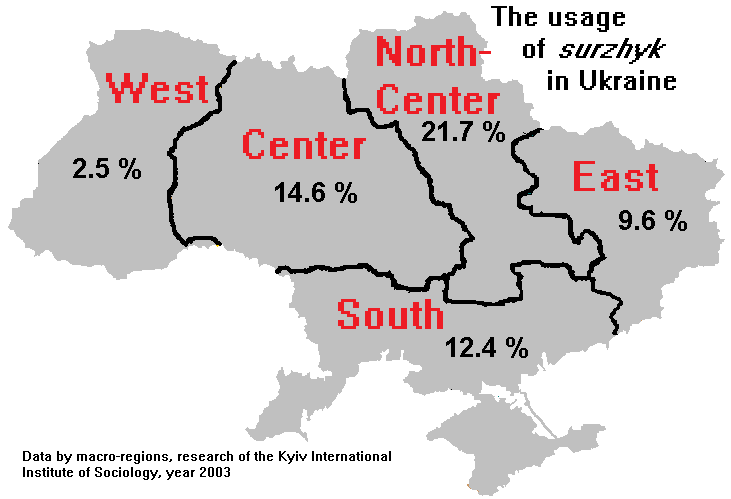 순수한 우크라이나어(즉, 러시아어 요소를 포함하지 않은 언어) 사용은 대부분의 도시 지식인들에게 기피되었는데, 이는 우크라이나어가 지방색과 민족주의와 연관되었기 때문이다.[3] 이 시점에서 대부분의 우크라이나인들은 러시아어를 능숙하게 구사하는 것을 어렵지 않게 생각했다. 우크라이나어가 농촌 생활 방식이나 편협한 민족주의와 연관되면서 더 많은 우크라이나인들이 러시아어를 선택하여 사용하게 되었다.[6] 이러한 결정은 일상적인 대화에서 수르지크어의 사용 빈도를 증가시키고 우크라이나어를 더욱 희석시키는 결과를 낳았다.
