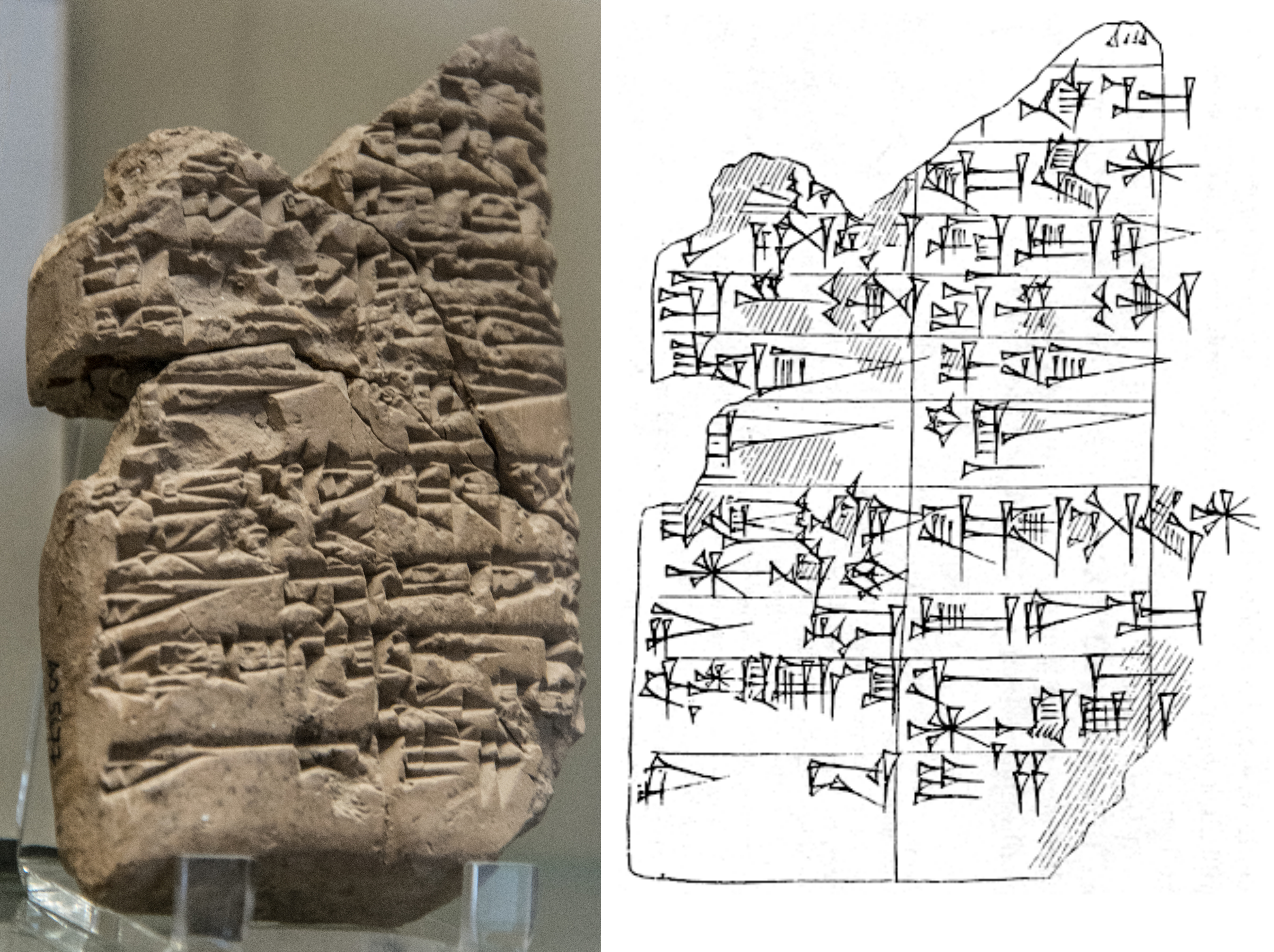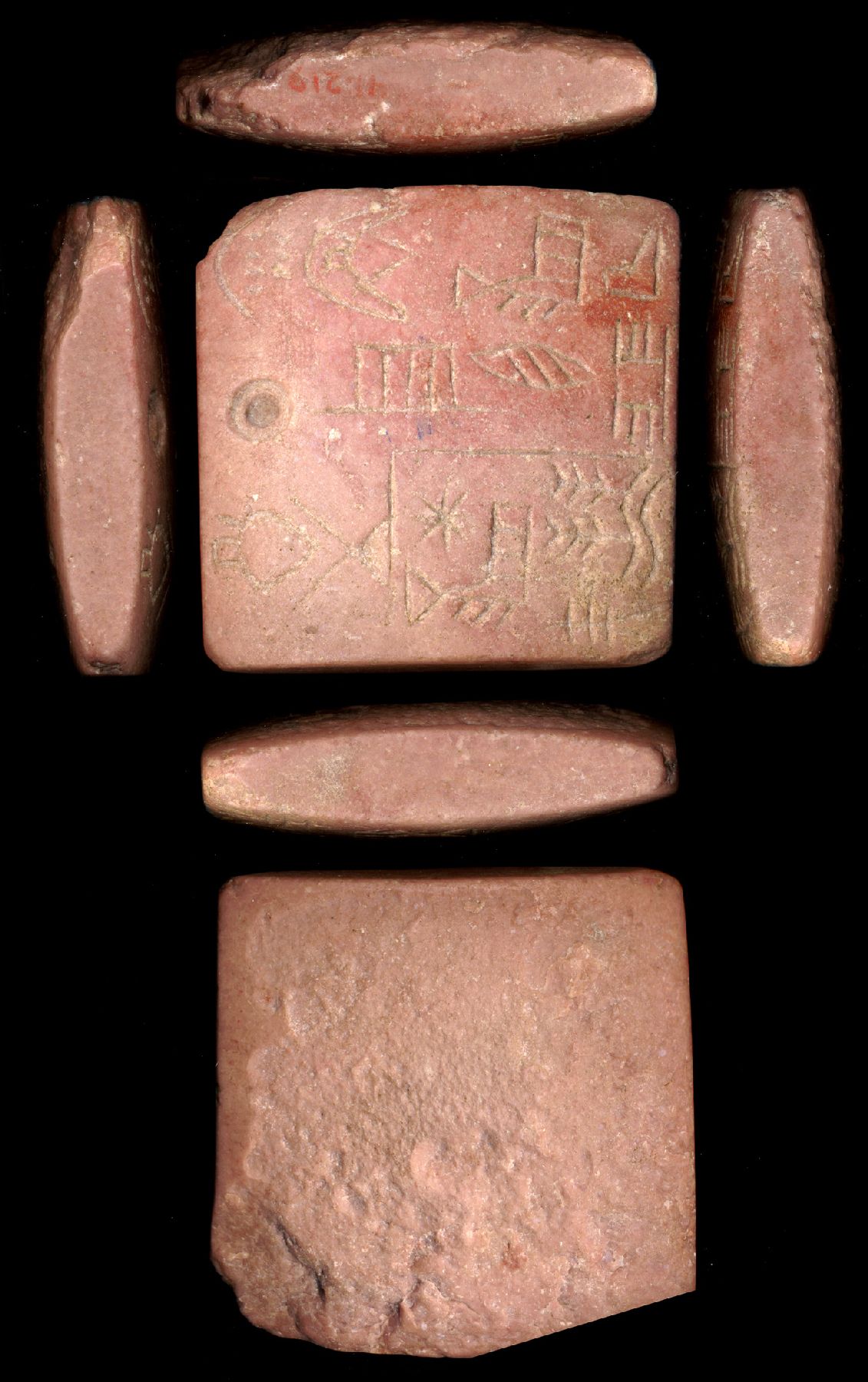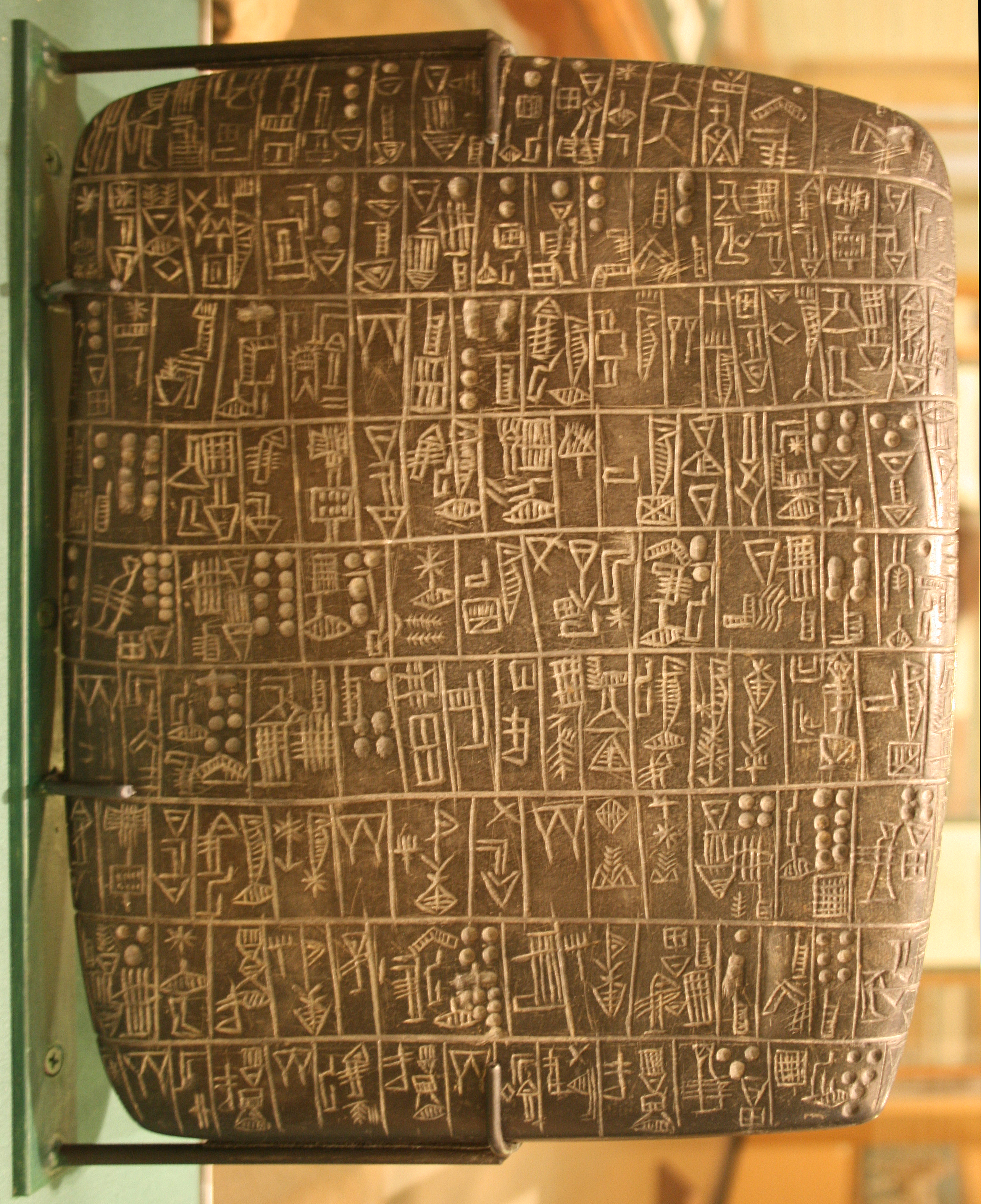 이 원시 문자기록판(기원전 3100년 – 기원전 2900년경)에는 토지 양도 내용이 기록되어 있다. (월터스 미술관(Walters Art Museum), 볼티모어)