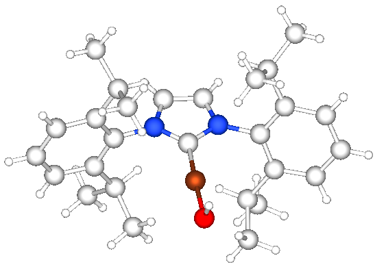 Cu(IPr)OH 외에도, 이량체 [Cu(IPr)]₂OH⁺ (BF₄⁻ 염)[10]) 및 아쿠아 착물 [Cu(IPr)]OH₂⁺ (SbF₆⁻ 염)[11]) 등이 X선 결정학으로 특성화되었다.참조
