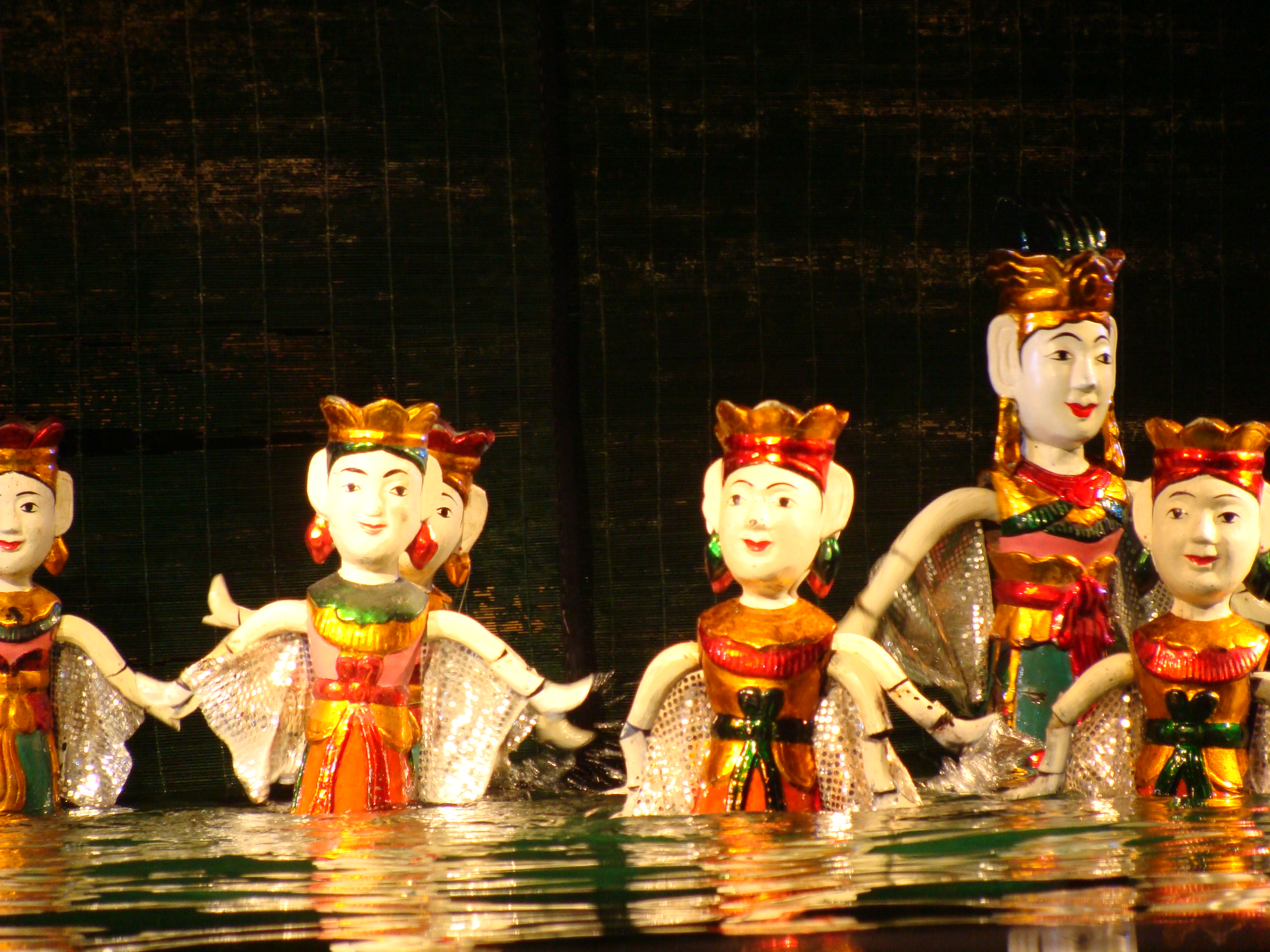 수상 인형극은 물을 이용한 무대, 인형 조종술, 전통 음악이 어우러진 베트남의 종합 예술이다. 인형들은 무대 양쪽에서 등장하거나 물속에서 갑자기 나타나며, 조명과 깃발은 축제 분위기를 연출한다.