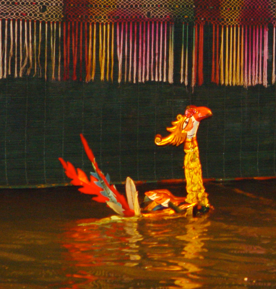 인형은 무대 양쪽 모두에서 등장하거나, 탁한 물 속에서 갑작스럽게 등장하기도 한다. 조명과 화려한 깃발이 무대를 장식하여 축제와 같은 분위기를 만들어 준다.