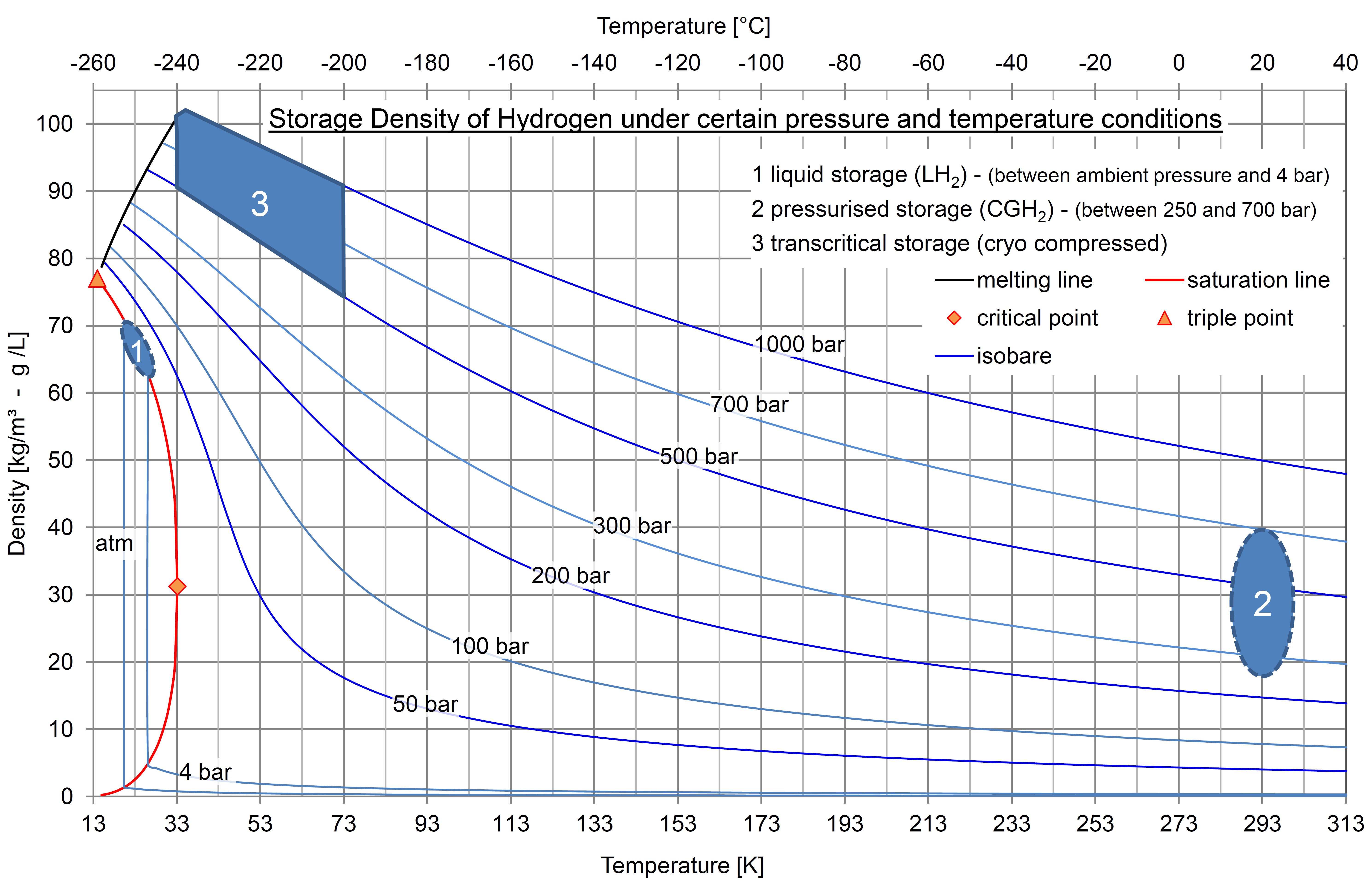 수소의 밀도는 압력, 온도 모두와 상관관계가 있으며, 이를 제어하여 저장한다.