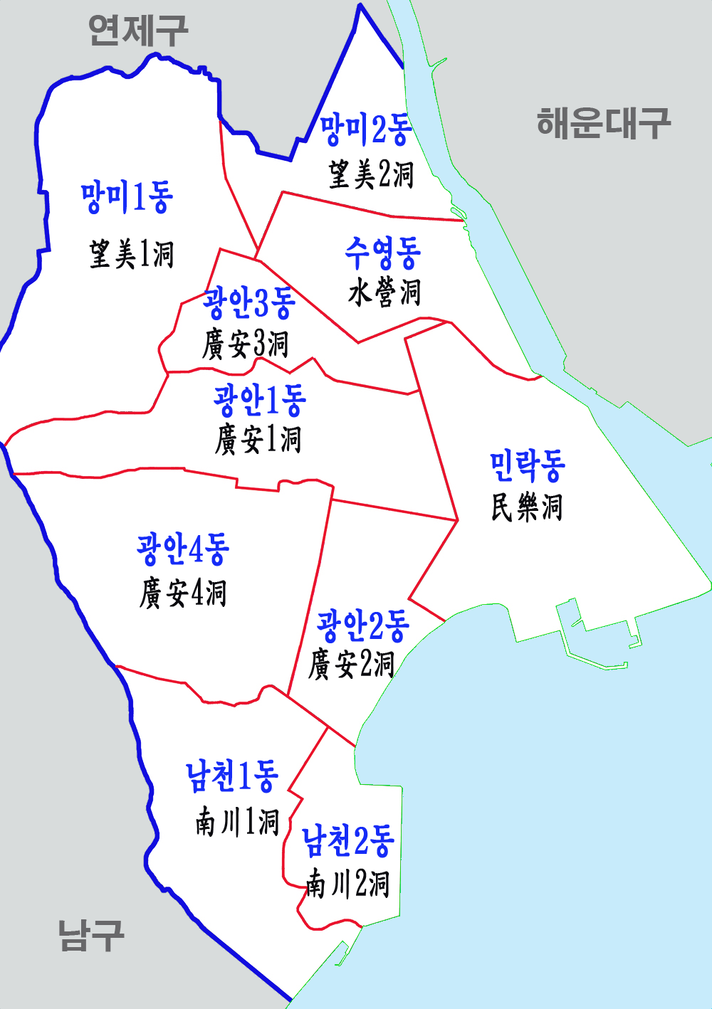 광안2동 | 廣安2洞 | 0.45km2 | 18,072 | 7,795 |