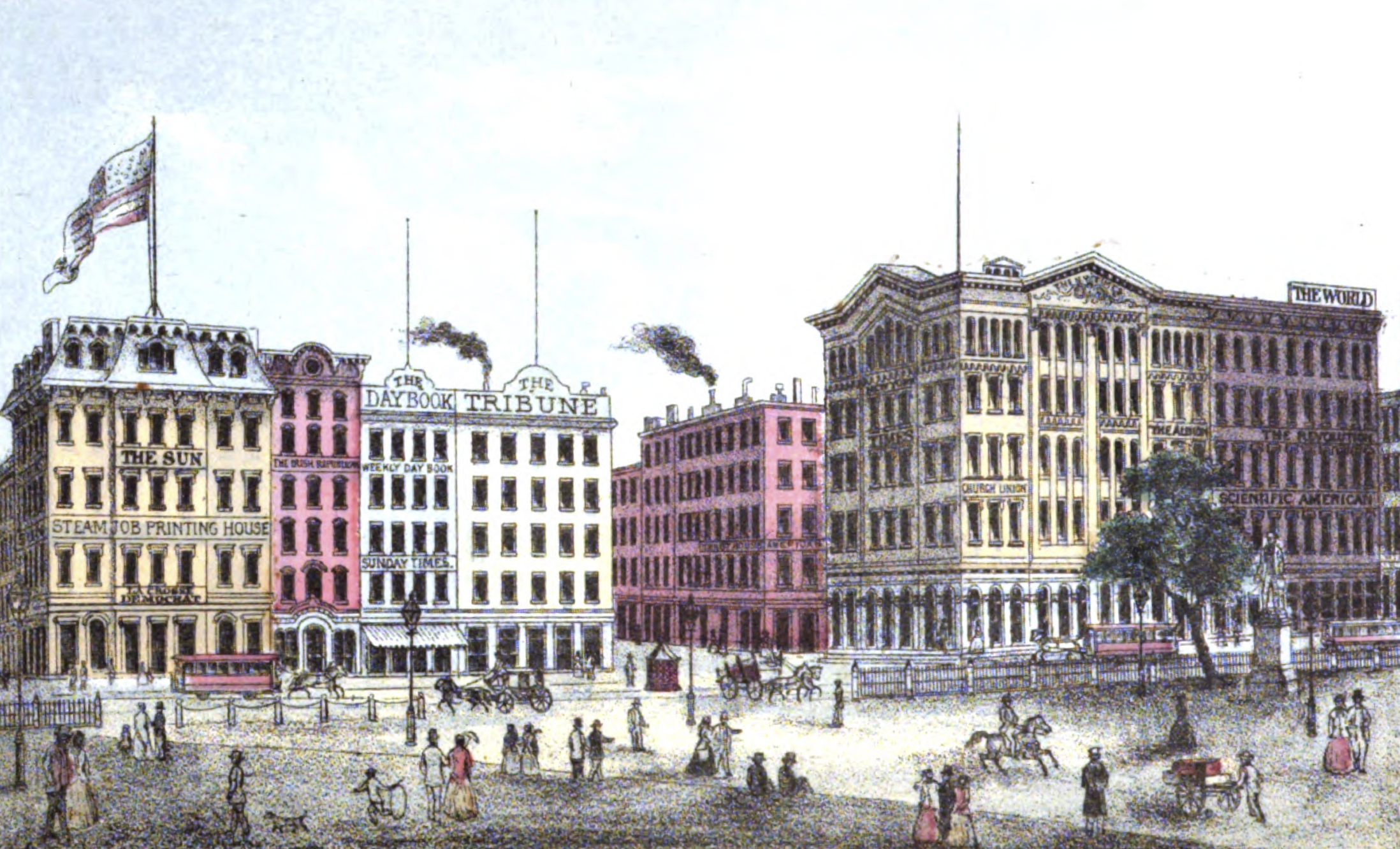1868년 맨해튼의 프린팅 하우스 스퀘어. "혁명" 신문 간판이 보인다.