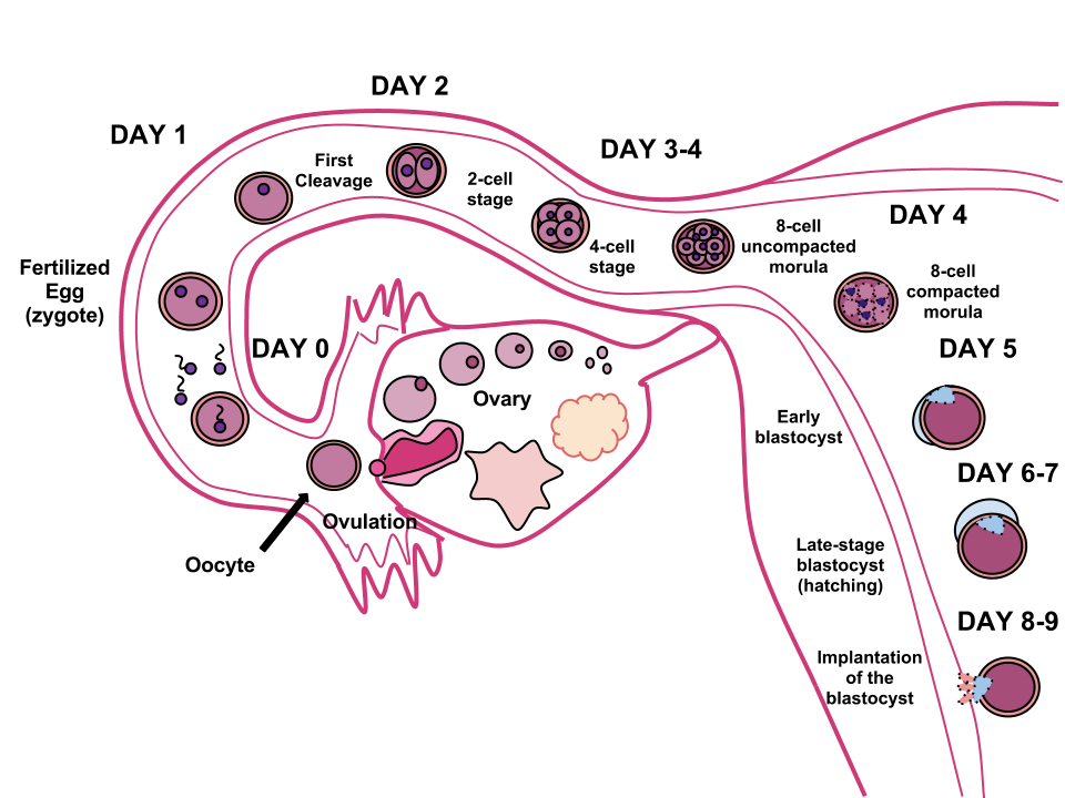 이 과정은 궁극적으로 이배체 세포인 접합자를 형성하게 된다. 접합자는 분열하여 배반포를 형성하고, 자궁에 들어가면 자궁내막에 착상하여 임신을 시작한다. 자궁 벽이 아닌 곳에서의 배아 착상은 어머니를 죽일 수 있는 자궁외임신을 초래한다.