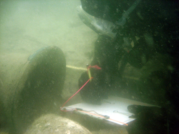 다이버들은 다양한 기술을 통해 수중에서 발견된 유물을 기록할 수 있다. 축척 도면은 고고학의 기본적인 도구이며 수중에서도 수행할 수 있다. 연필은 영구 트레이스, 플라스틱 다이브 슬레이트 또는 무광 라미네이팅 종이에 수중에서도 필기가 가능하다.[38][39]5. 3. 3. 사진 측량법