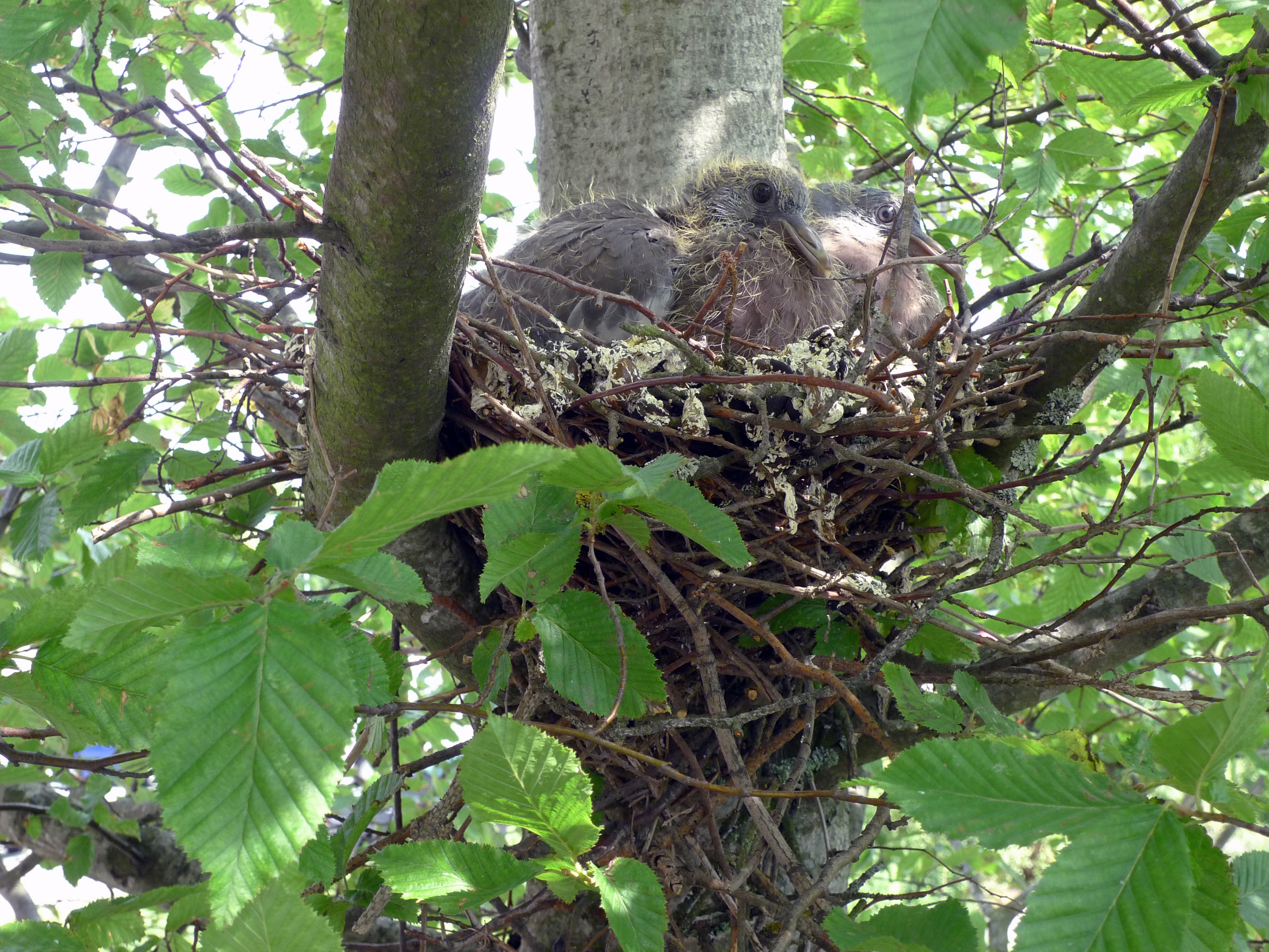 숲비둘기의 육추성공률은 조건에 따라 다른데, 야지에 사는 개체의 경우 많은 알과 새끼가 천적의 먹잇감이 되기 때문에 실패율이 최대 65%인 반면 도시에 둥지를 트는 개체는 20% 이하로 낮다. 알이나 새끼의 주된 천적은 큰까마귀, 송장까마귀, 까치와 같은 까마귀과 조류가 주를 이루며 다 큰 숲비둘기에게는 참매, 유럽소나무담비, 북방족제비, 청서 그리고 집고양이가 주된 천적이다.[26]