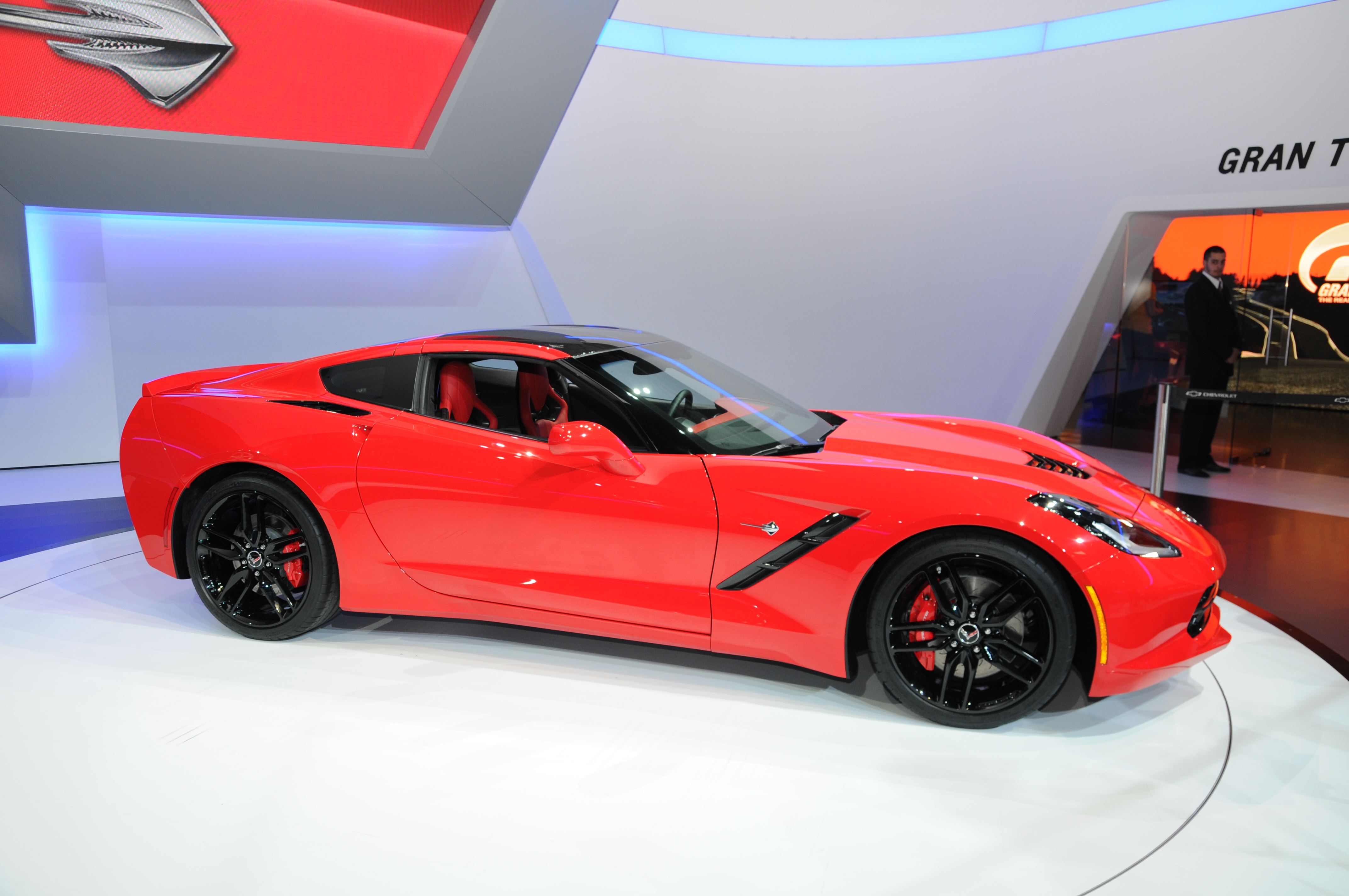 2014년형 콜벳은 2013년 1월 13일 일요일 북미 국제 오토쇼에서 디트로이트에서 데뷔했으며,[6] 쉐보레는 콜벳의 새로운 교차 깃발 로고를 선보였다.