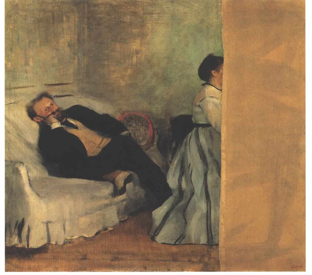 에두아르 마네와 에드가 드가는 1862년 루브르 박물관에서 우연히 만나 친구가 되었다. 1868년, 드가는 마네와 그의 아내의 초상화를 그렸다. 그림 속 마네는 소파에 기대어 앉아 있으며 쉬잔은 피아노에 앉아 연주하고 있는 것으로 보인다. 그러나 이 그림은 작품 속 쉬잔의 몸을 가르며 세로로 찢겨 나갔다. 확실하진 않지만 마네가 의도적으로 찢은 것으로 추측된다. 이유는 확실하진 않지만 드가가 쉬잔을 그린 방식이 마음에 들지 않아서, 아니면 당시 드가와 불화가 있어서, 아니면 아내에게 화가 나서 그림을 찢었을 것이라는 추측들이 있다. 결국 마네는 《피아노를 치는 마네 부인》을 그려 피아노를 치는 쉬잔을 자신의 그림으로 다시 묘사했다. 드가는 자신의 그림이 찢어졌다는 사실을 알고 에두아르에게 그림을 돌려달라고 요구한 후 그림을 다시 가져갔다. 드가는 피아노 앞에 앉아 있는 쉬잔의 모습을 다시 그리려고 했으며, 세기가 바뀔 무렵 미술상인 앙브루아즈 볼라르와 대화하면서 그 의도를 다시 한 번 강조했다. 그러나 드가는 그림을 고칠 방법이 없었고 이 그림은 일본 기타큐슈 시립 미술관에 찢어진 상태 그대로 전시되어 있다.[6][7][8]