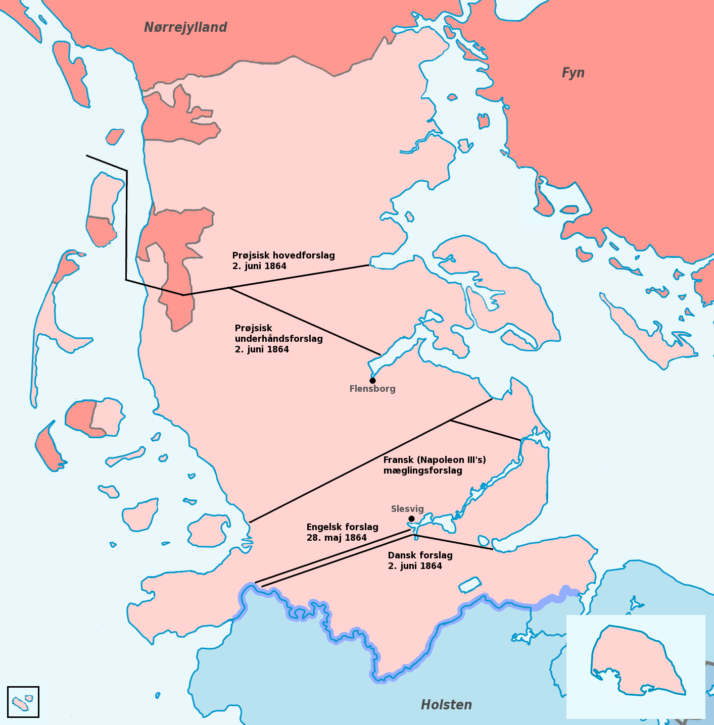 나폴레옹 3세의 지지를 받았던 해결책은 슐레스비히를 민족성에 따라 분할하여 덴마크 지역을 덴마크에, 독일 지역을 홀슈타인에 할당하는 것이었다. 이 아이디어는 덴마크인과 독일인 모두에게 지지를 받았지만, 당시에는 양측의 강경한 태도로 실행 불가능했다.[4] 이 해결책은 이후 베르사유 조약의 조건으로 1920년 국민투표를 통해 시행되었고, 북슐레스비히는 덴마크로 반환되었다.