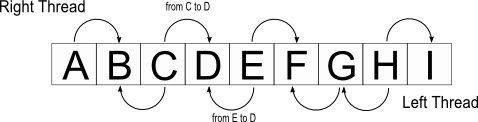 아래 그림으로 예시된 스레드 트리의 중위 순회 순서는 A, B, C, D, E, F, G, H, I이다. 이 순서에 따라, 노드 E의 선행 노드는 D가 되고, 후행 노드는 F가 된다.