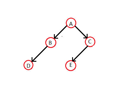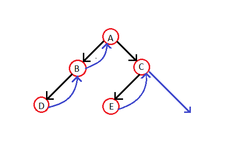 위 그림과 같은 일반적인 이진 트리가 있다고 가정한다. 이 트리의 중위 순회 결과는 D, B, A, E, C 순서이다. 중위 순회 순서를 기반으로 스레드를 연결하면 다음과 같은 스레드 이진 트리를 만들 수 있다.