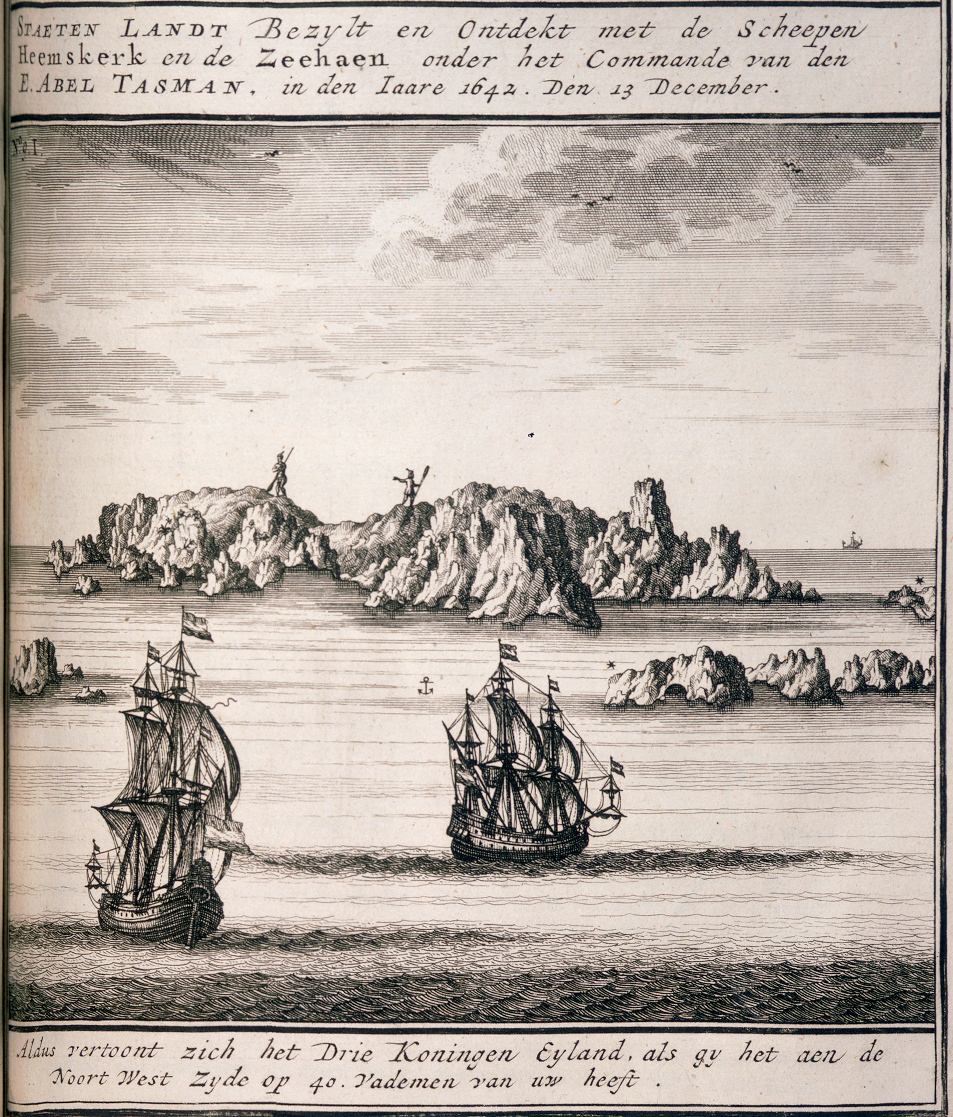 1643년 1월 6일, 아벨 타스만이 이끄는 네덜란드 탐험대가 이 섬을 발견하고 '드리에 코닌겐 아일랜드'(Drie Koningen Eiland, 쓰리킹스 섬)라고 명명했다.[4] 타스만은 물을 찾아 이 섬에 정박했는데, 주현절을 기념하여 주요 섬의 이름을 이렇게 지었다. 그는 또한 안토니 반 디먼의 아내 이름을 따서 곶에 '케이프 마리아 반 디먼'이라는 이름을 붙였다. 이 두 지명은 타스만이 뉴질랜드에 붙인 이름 중 현재까지 유지되는 유일한 지명이다. 타스만은 섬에 30~35명 정도의 주민이 살고 있으며, 나무가 없다는 것을 확인했다.[4]