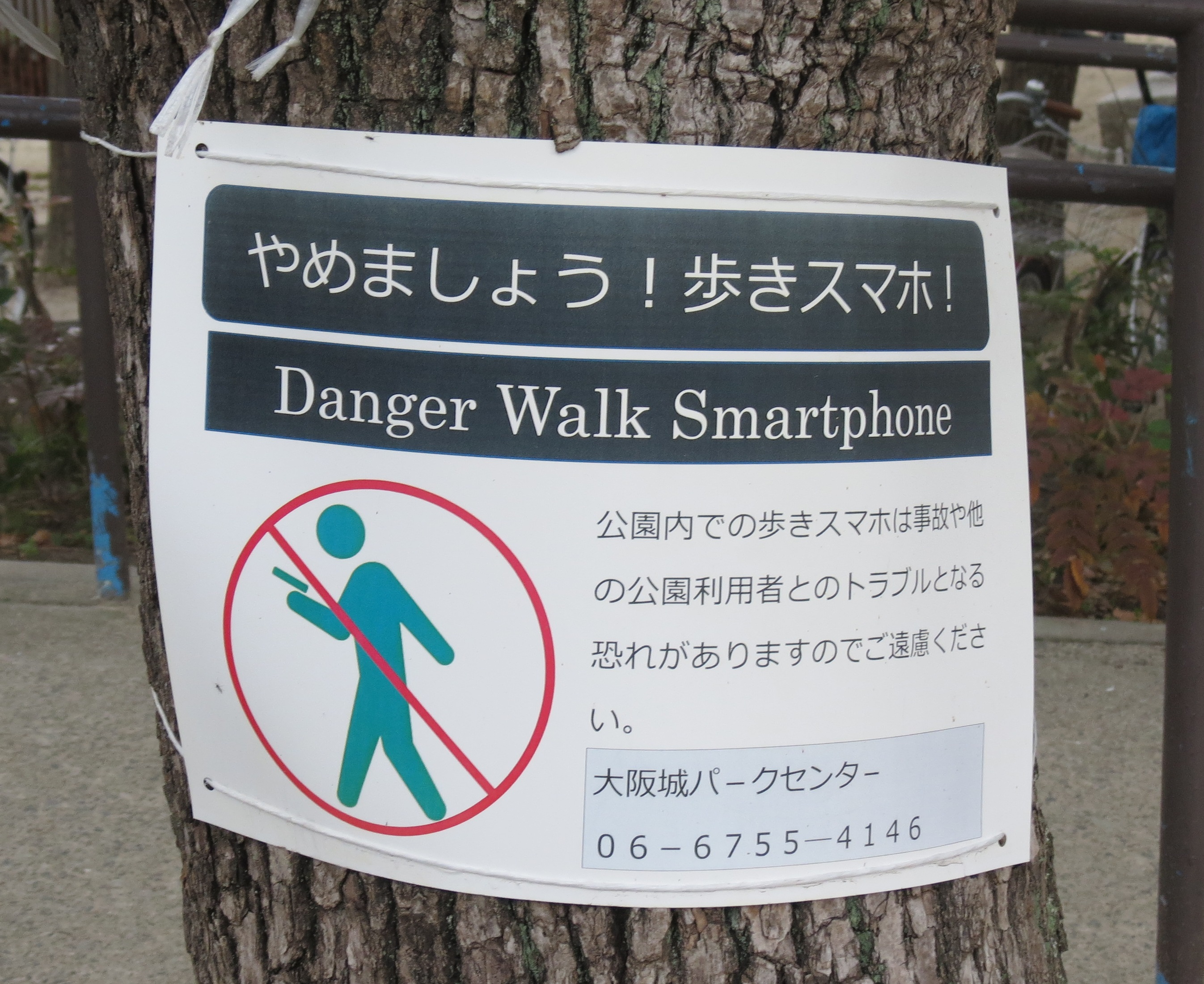 간사이 지방의 철도 회사 및 자치 단체 교통국 15개 사국은 2013년 9월에 15일 동안 "보행 중 스마트폰은 삼가 주세요"라고 적힌 포스터를 역에 게시했으며, JR 서일본과 오사카 시영 지하철에서는 기간 종료 후에도 주요 역과 일부 역에서 지속적으로 게시했다.[23]