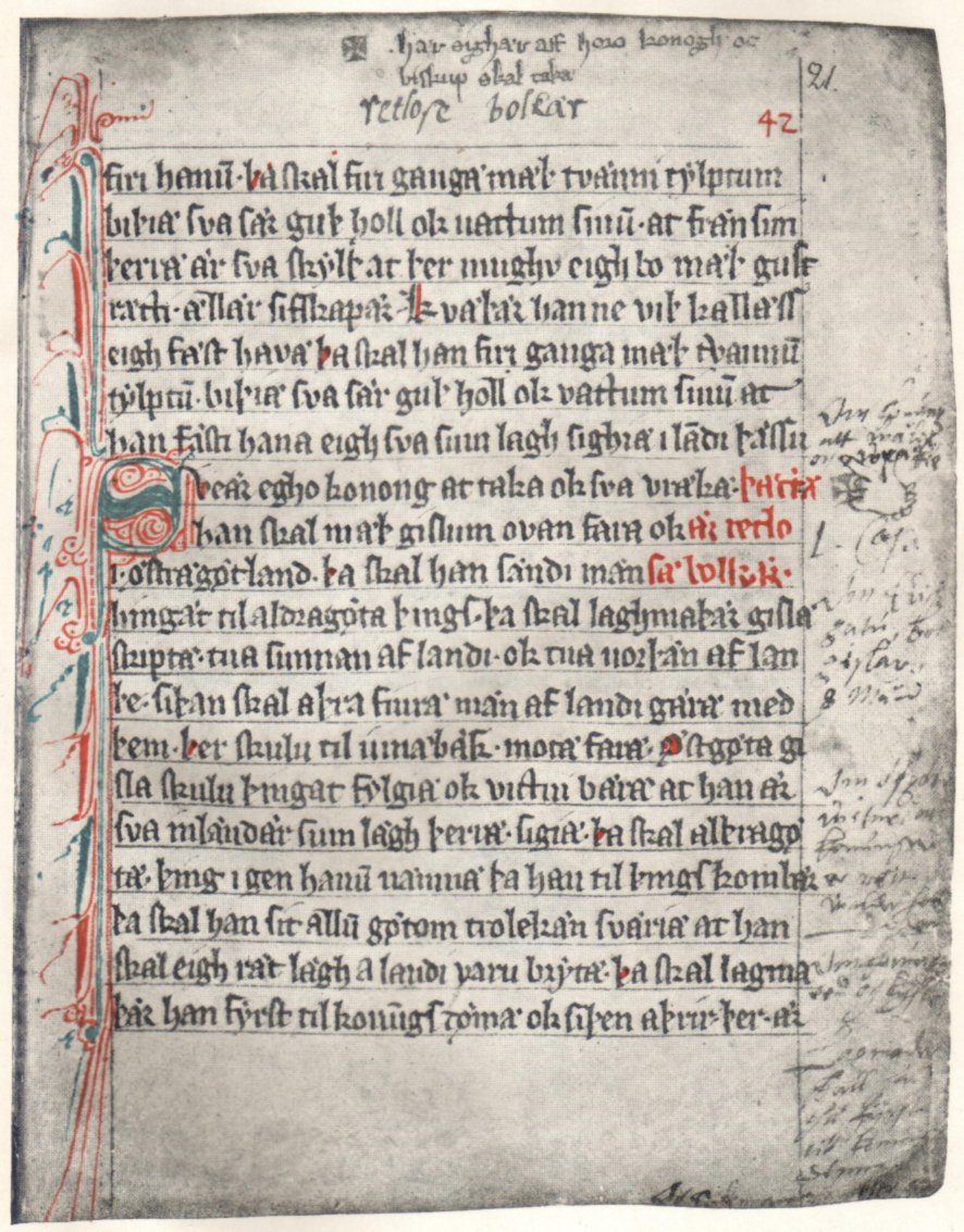 원래 룬 문자로 쓰였지만, 기독교화와 함께 라틴 문자로 쓰이게 되었고, 그리스어와 라틴어에서 많은 차용어가 유입되었다. 13세기 말부터 14세기에 걸쳐 한자 동맹이 세력을 키우면서 중기 저지 독일어(저지 사크센어)의 영향을 받았다. 4격 3성이었던 명사의 어형 변화는 16세기까지 현재의 2격 2성으로 단순화되었다.