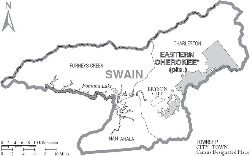 인구가 더 고립된 스웨인 군에서는 인구 증가가 느렸다. 유럽계 미국인들은 재건 시대인 1871년에 잭슨 및 메이컨 군의 일부에서 형성될 때까지 조직하지 않았다. 이 지역은 인디언 이주 시대인 1832년부터 1835년까지 노스캐롤라이나 주지사를 지냈고 1835년부터 1868년까지 노스캐롤라이나 대학교 총장을 역임한 데이비드 L. 스웨인의 이름을 따서 명명되었다.