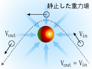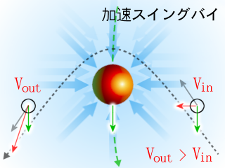 우주선은 행성에 접근하며 중력에 의해 가속되고, 행성 근방에서 최대 속도에 도달하며 궤도가 "く"자 모양으로 꺾인다. 이후 행성에서 멀어지며 중력으로 감속된다. 행성이 운동하지 않으면 증속과 감속은 상쇄되어 속도는 변하지 않고 운동 방향만 바뀐다.
