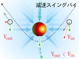 반대로, 행성 공전 방향 앞쪽을 통과하면, 우주선은 행성 공전 반대 방향으로 꺾여 공전 속도만큼 감속된다.