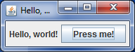 다음은 스윙 기반의 간단한 프로그램 예시이다. 이 프로그램은 레이블과 버튼이 있는 창(javax.swing.JFrame)을 표시한다.```java