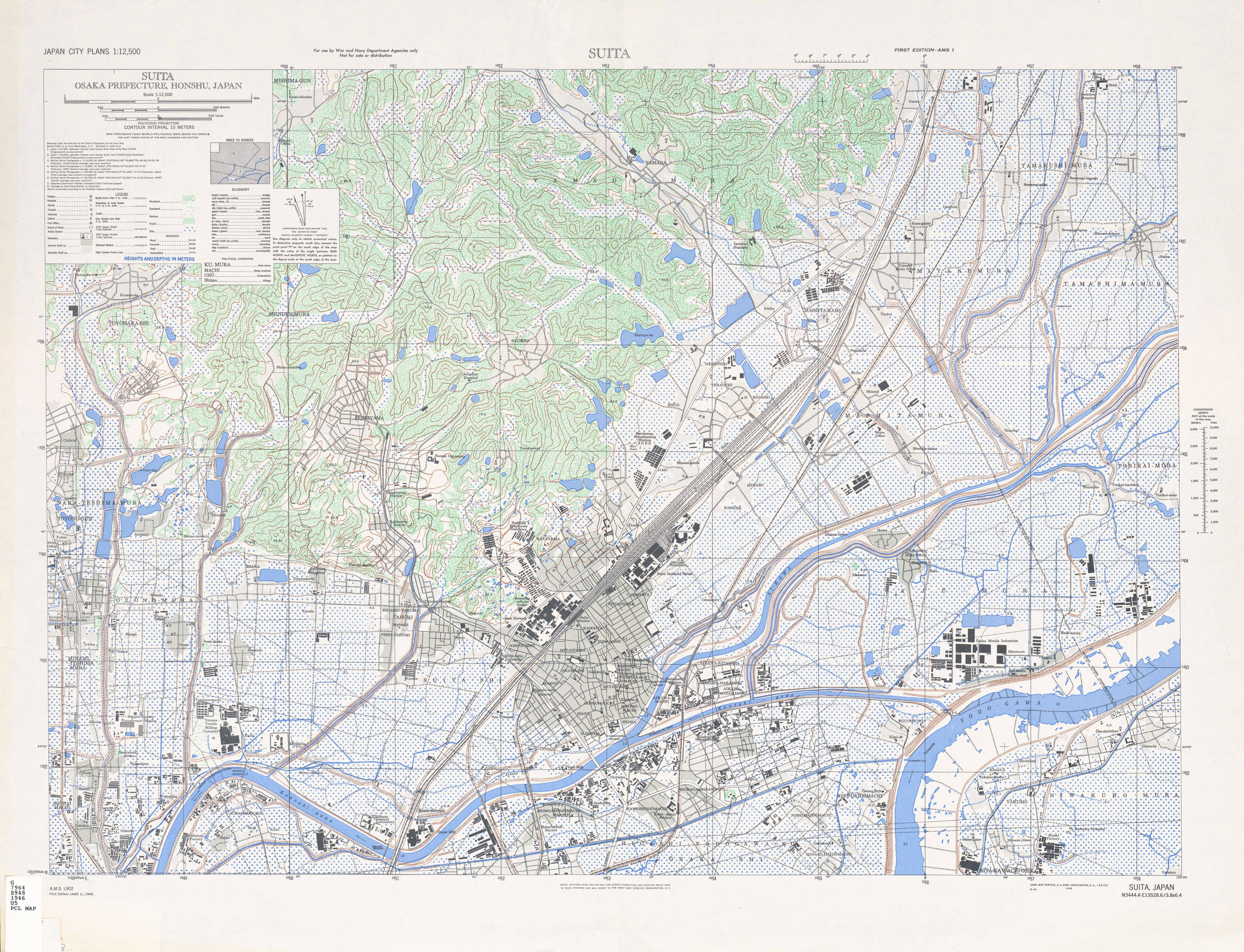 - 1940년: 미시마군의 스이타 정, 지사토 촌, 기시베 촌, 도요노군 도요쓰 촌이 합쳐져 스이타 시가 되었다. 당시 면적은 20.45km², 인구는 63,181명이었다. 초대 시청은 스이타 정청 건물을 그대로 사용하였다.