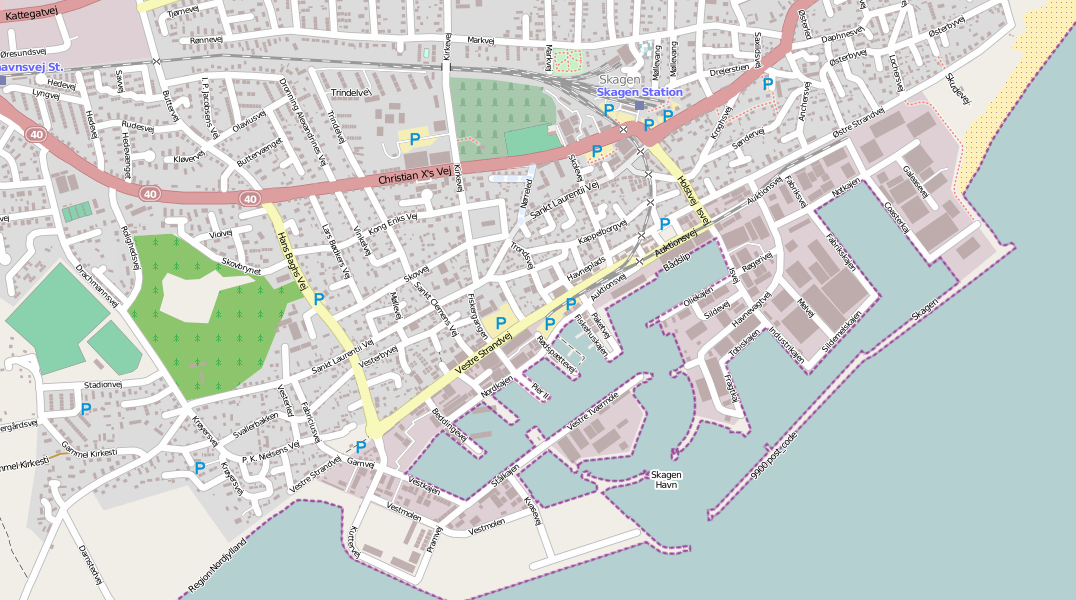 스카겐은 덴마크 최북단 도시로, 프레데릭스하운에서 북쪽으로 41km, 올보르에서 북동쪽으로 108km, 오르후스에서 북동쪽으로 226km 떨어진 곳에 위치한다.[12] 이 도시는 북해와 덴마크 해협 사이의 바다로 뻗어 나가는 반도에서 이름을 따왔다. 가장 오래된 지역은 남쪽 해안을 따라 자리 잡고 있으며, 감멜 스카겐(Old Skagen, 호옌)은 서쪽의 노르스트란드 옆에 있다. 베스터비와 외스터비는 작은 어부의 오두막과 좁은 골목길로 유명하다.[40] 덴마크 국도 40번이 스카겐을 통과하여 프레데릭샤운으로 이어진다.[13]