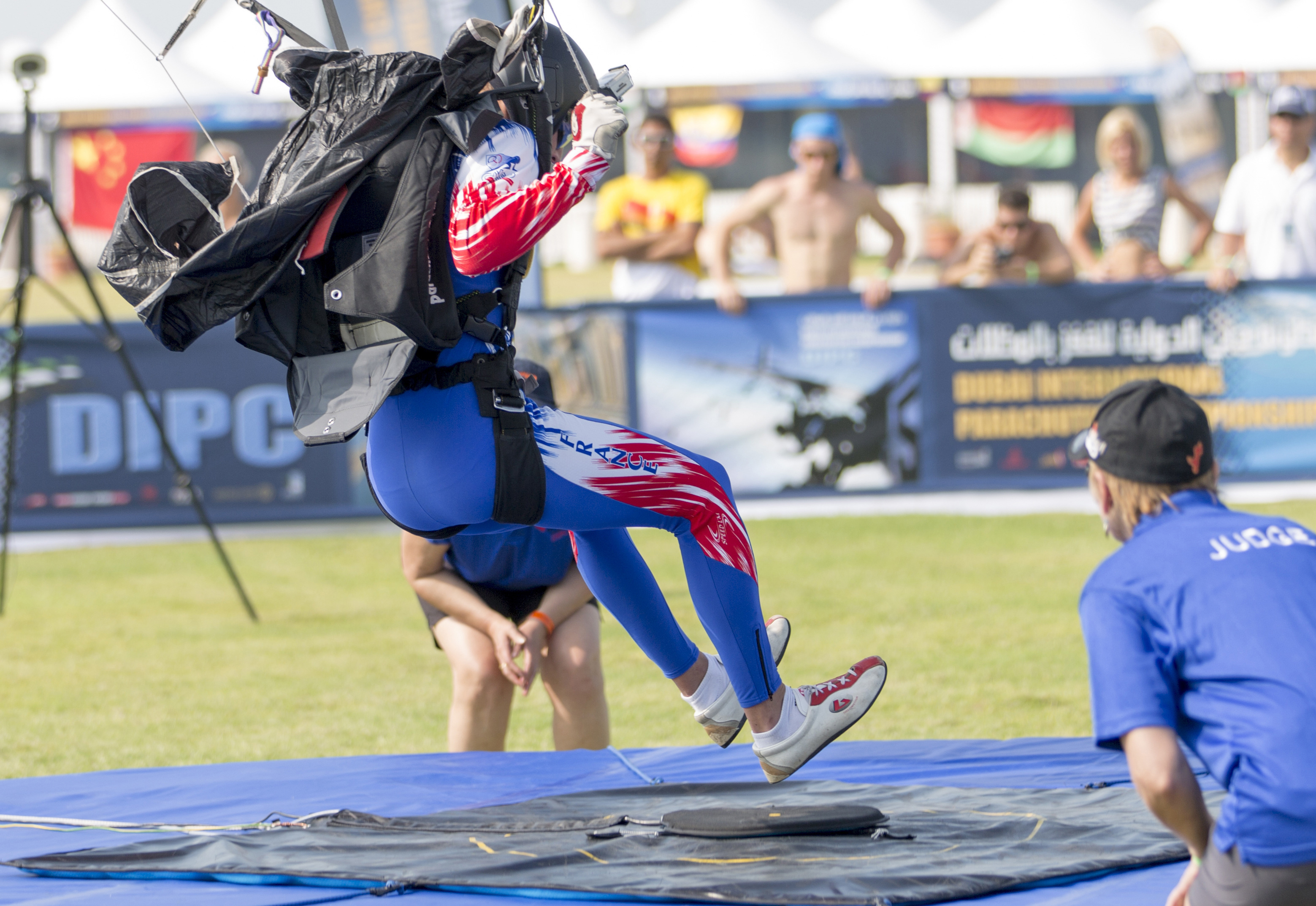 패러슈트 조종 정밀도를 겨루는 경기로, 바람 상황을 읽으면서 패러슈트를 조종하여 지상에 놓인 타겟에 얼마나 가까이 착지할 수 있는지를 겨룬다. 타겟의 중심은 데드센터(dead center)라 불리는 지름 3cm의 원이며, 일반적으로 구두 뒤꿈치로 그곳에 닿는 것을 목표로 한다. 데드센터를 밟으면 측정은 0cm가 된다.